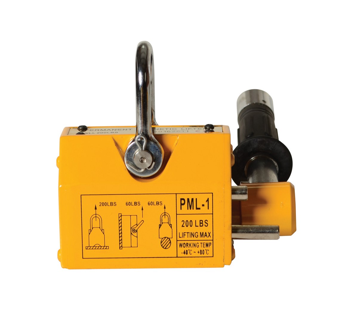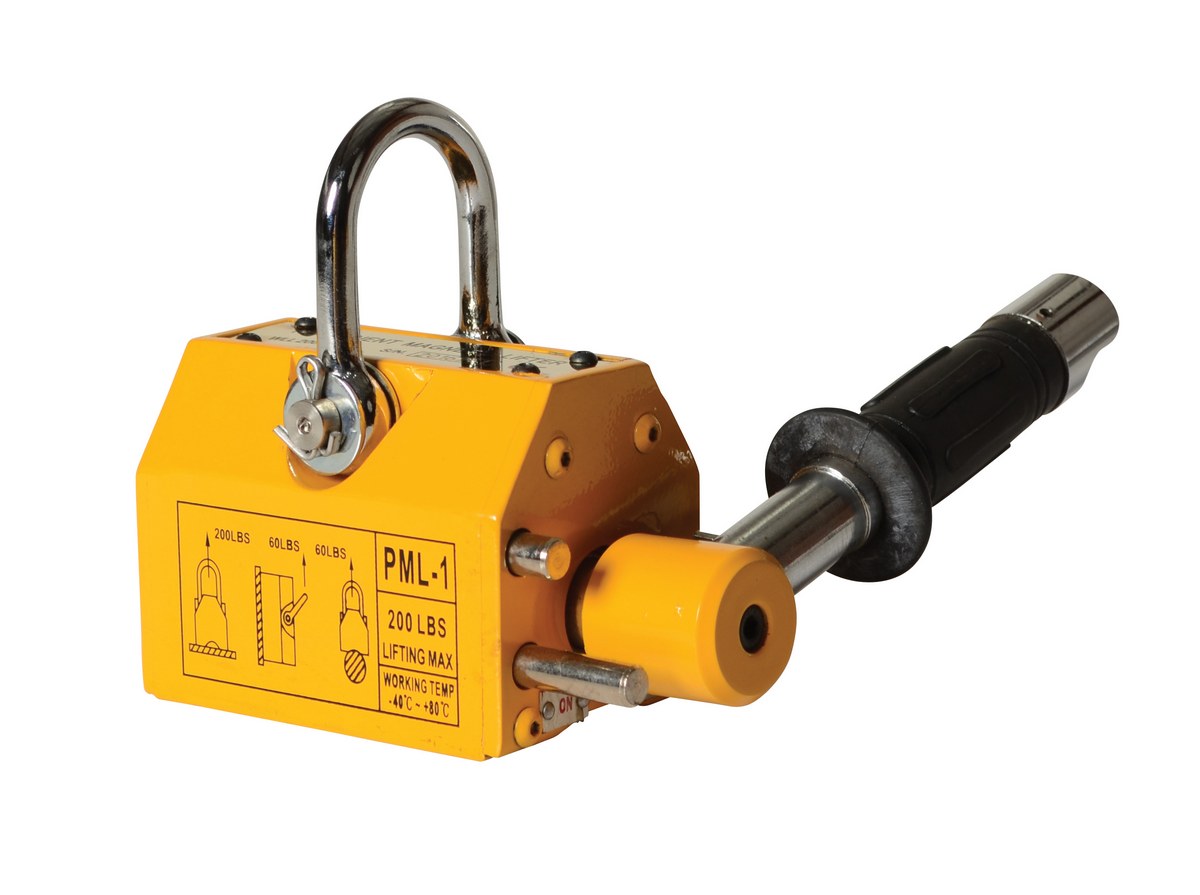 Steel and Neodymium Magnetic Lifter 5-15/16 In. x 6-3/4 In. x 4-29/32 In. 200 Lb. Capacity YellowPick up sheets of material by use of overhead crane or chain with the permanent magnetic lifter. Magnet is activated or deactivated by simply rotating the lever. Lifter is lightweight, so transporting from work area to work area is convenient.