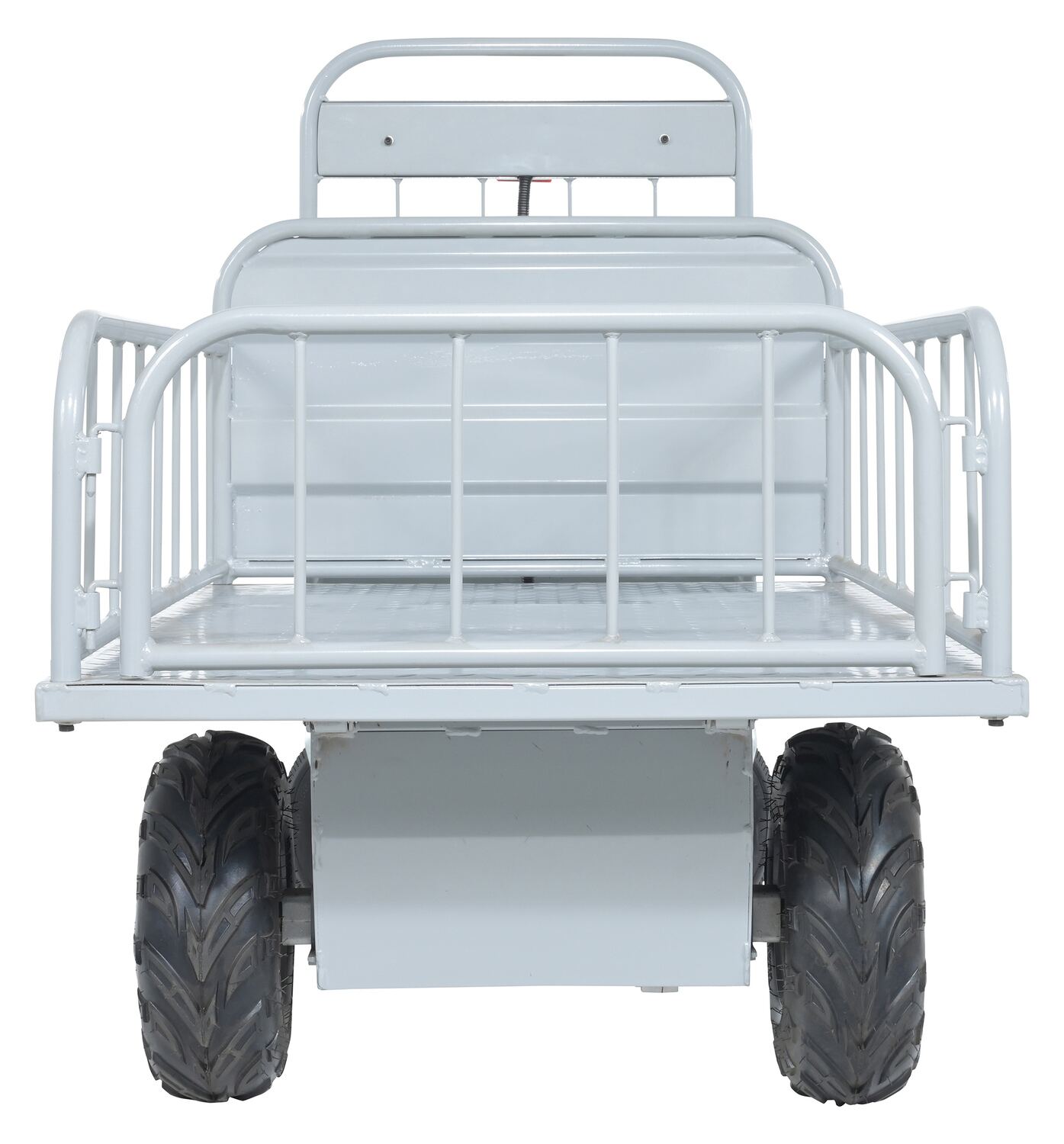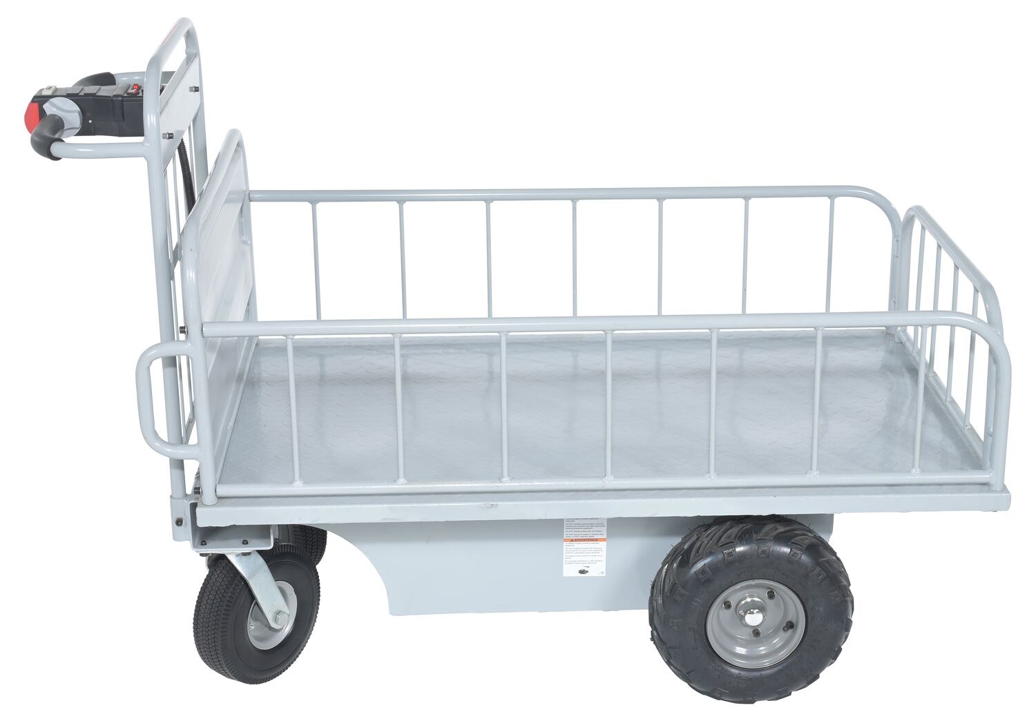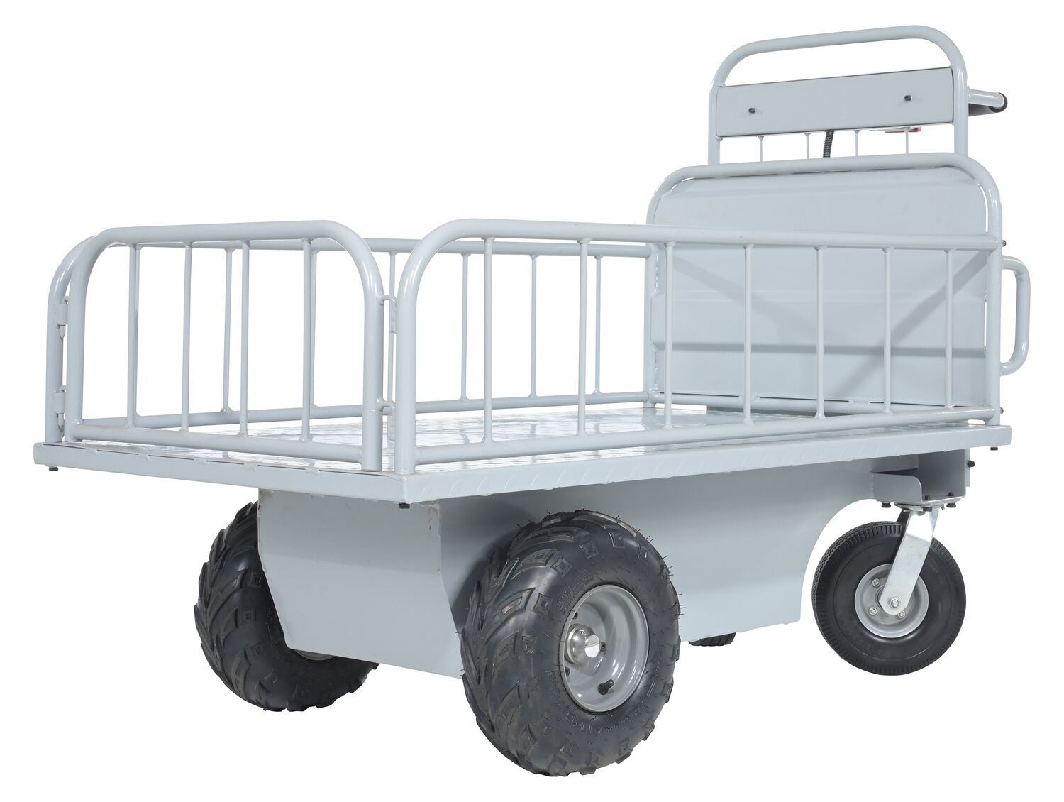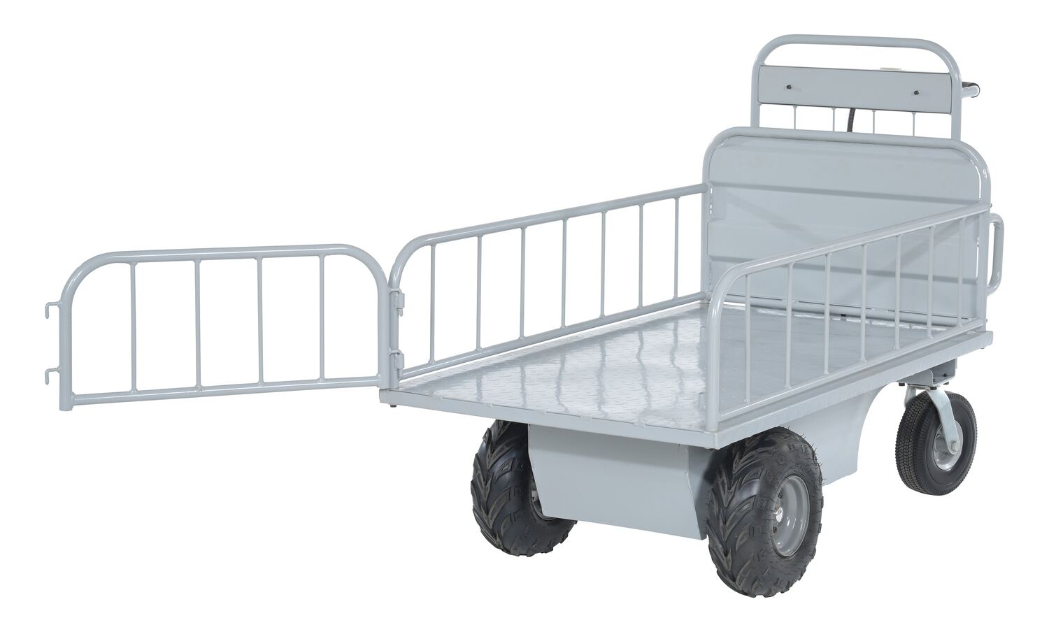 Steel Off-Road Traction Drive Cart 500 Lb. Rough Terrain Capacity GrayThe off-road traction drive powered cart is ideal on the farm or in the factory. Forward/reverse switch. Side guards are removable.
