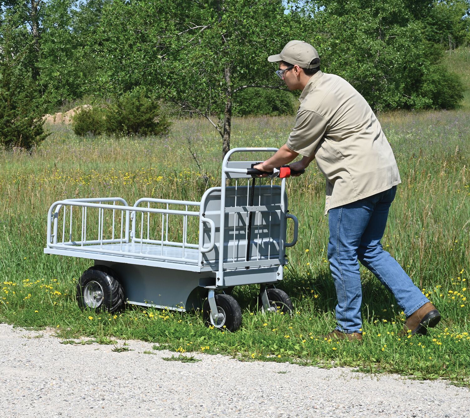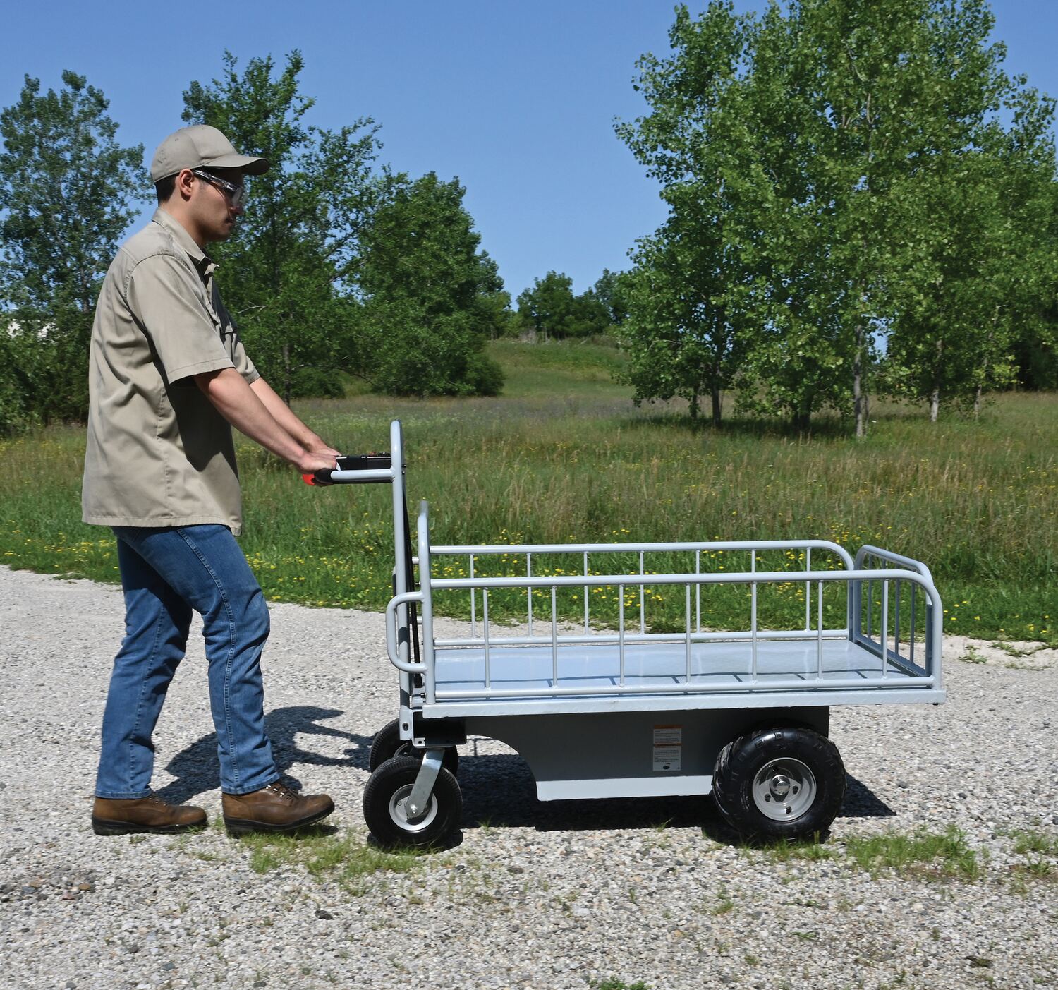 The off-road traction drive powered cart is ideal on the farm or in the factory. Forward/reverse switch. Side guards are removable.