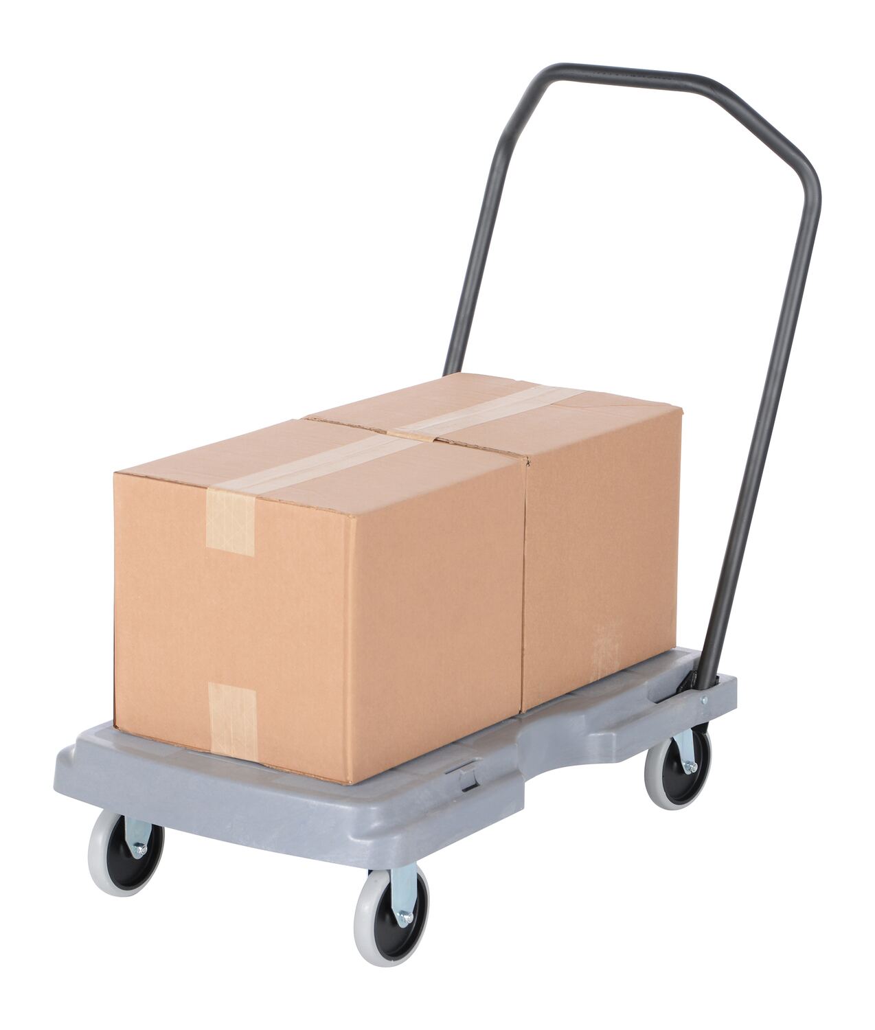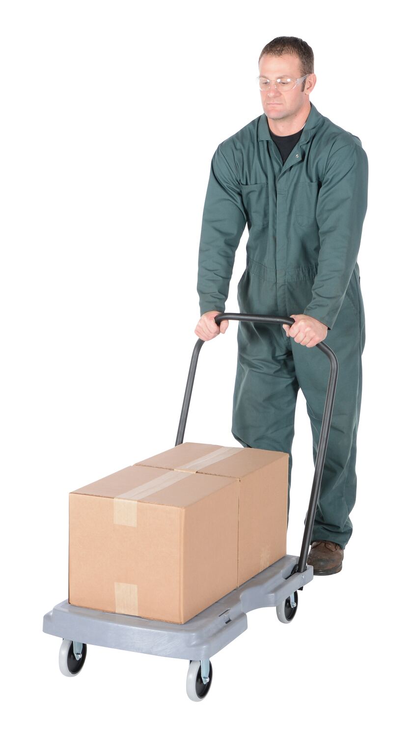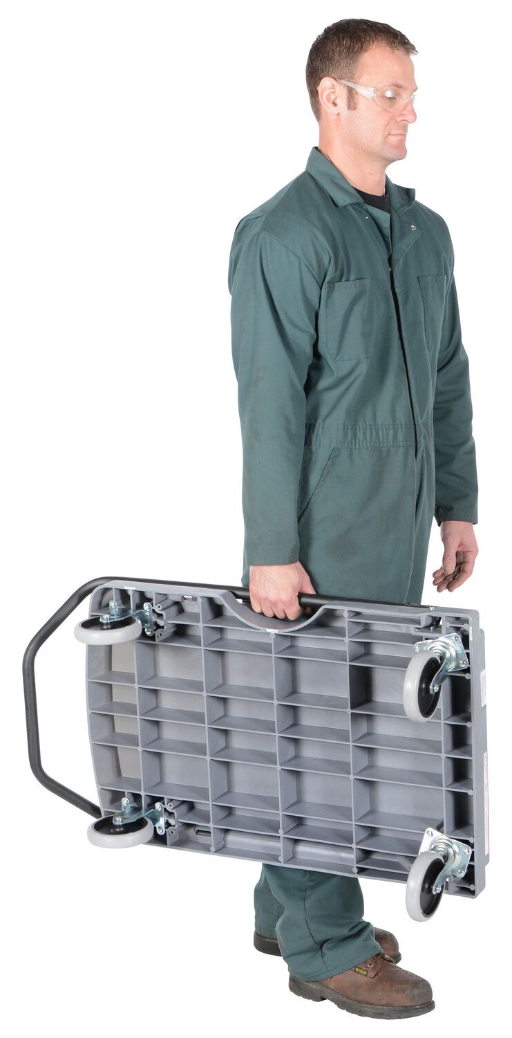 High Density Polyethylene Platform Truck Ergonomic Fold Down Handle 31-1/2 In. x 20-1/2 In. x 11 In. 500 Lb. Capacity GrayTransport products quickly and easily in commercial or industrial applications with the versatile Platform Truck with fold down handle. Adjustable handle for pushing or pulling applications, folds down for storage. Will not rust, chip, or dent. Unit rolls smoothly on polyurethane casters.