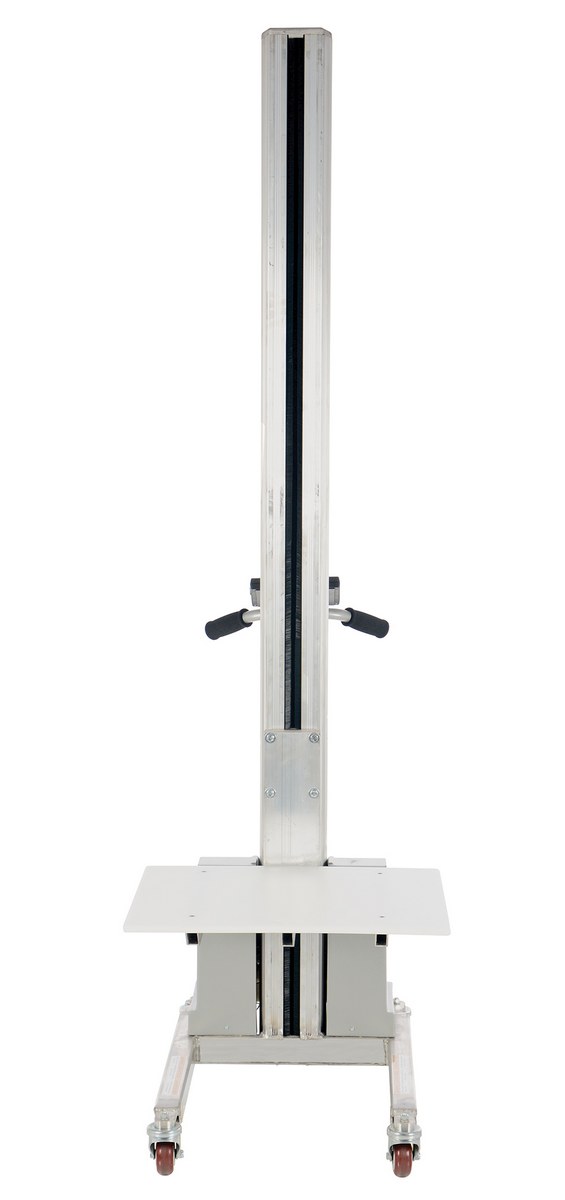Aluminum Quick Lift DC Powered 72 In. Raised Height 125 Lb. CapacityThe DC powered quick lift is a quiet, lightweight unit used for transport and positioning loads quickly with just the push of the button. The unit is battery operated with a high density polyethylene platform. It features a low profile design for maneuvering in narrow aisles and confined spaces. The poly casters consist of two swivel and two swivel-locking that are standard. The DC system runs with an AC on-board charger.