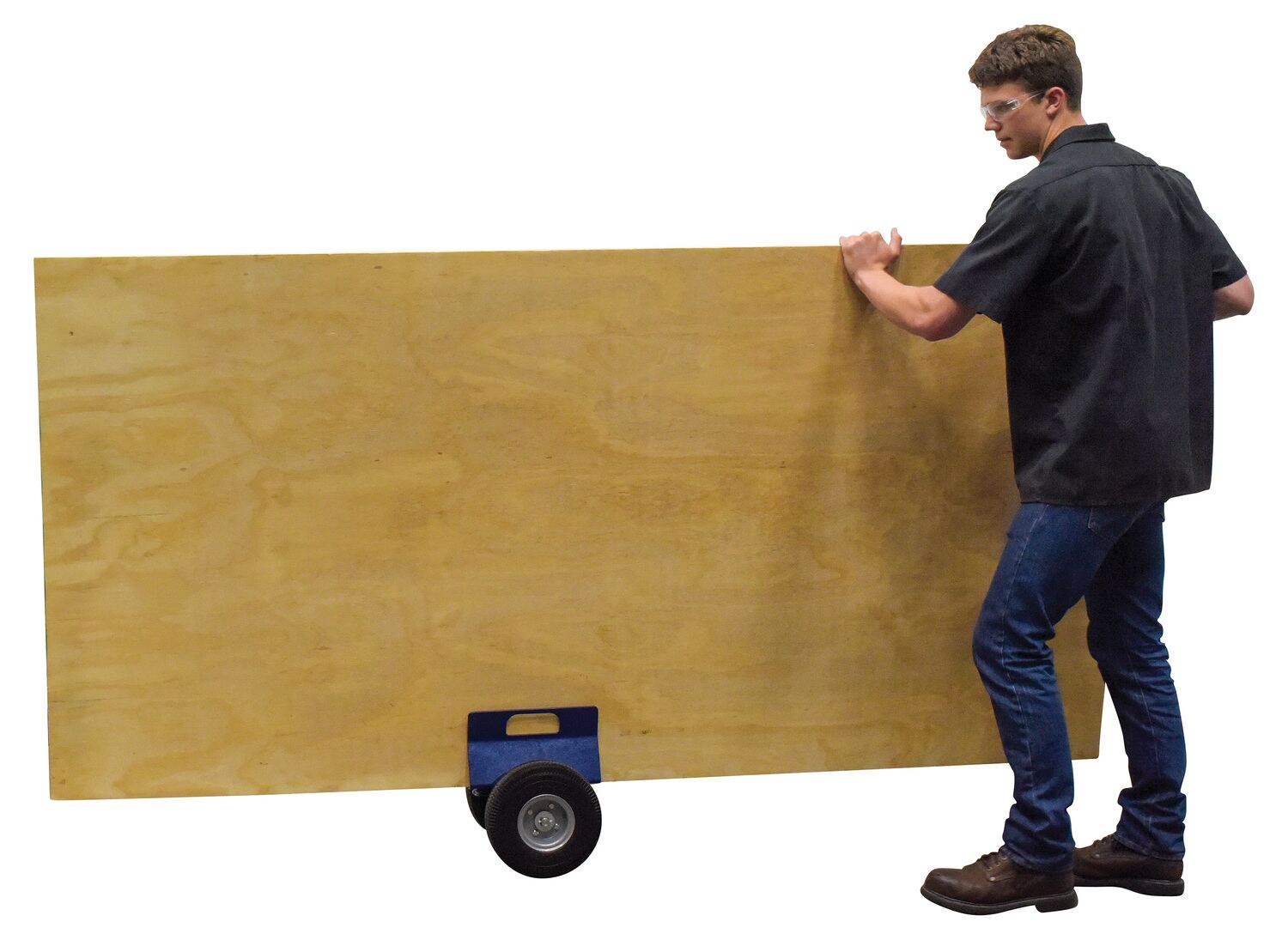 Steel Heavy Duty Adjustable Panel Dolly With Foam Filled Wheels 12 In x 12-13/16 In x 13-1/4 In 500 Lb. Capacity BlueThis heavy-duty plate/slab dolly has an auto-clamp feature. The unique design grips plate/slab when weight is added. Opening for use with thick plate/slab. Hand holds are great for carrying. Steel construction with line-X lining inside.