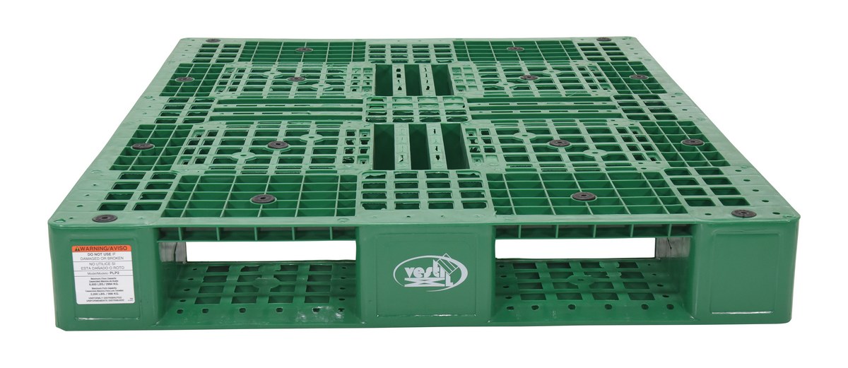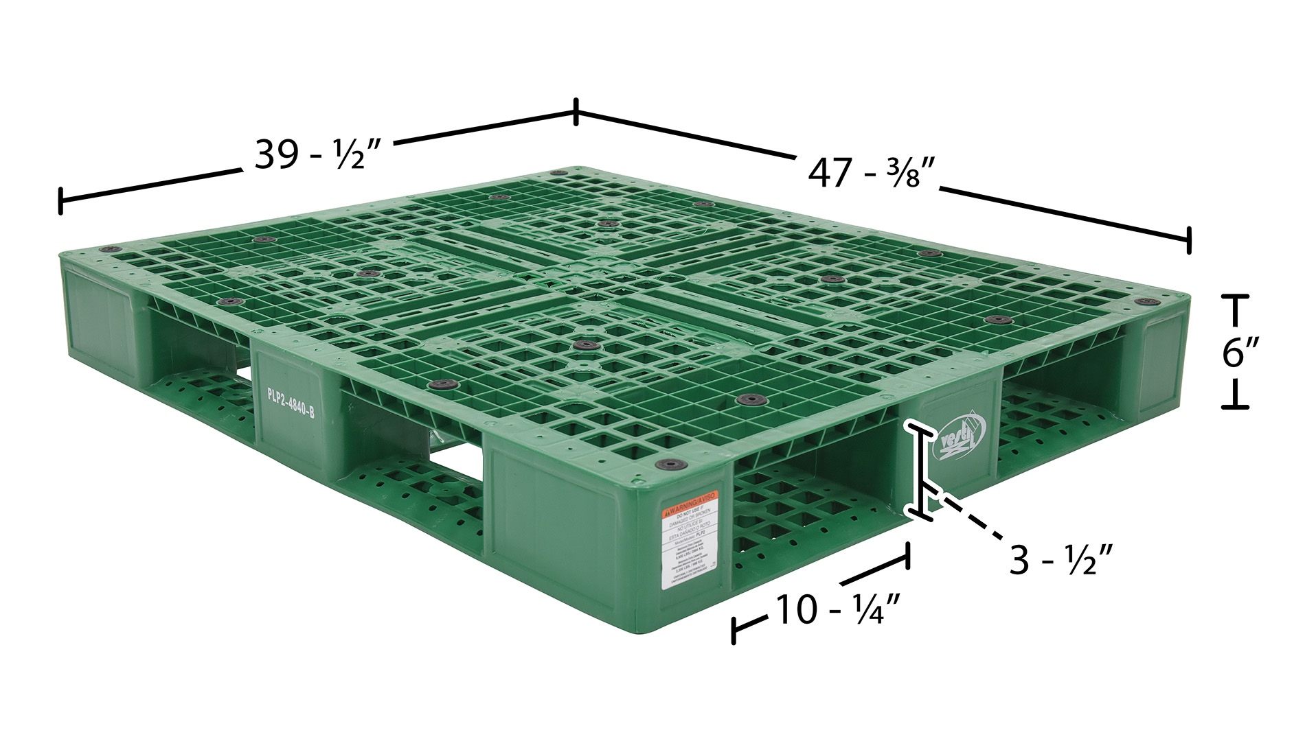 High Density Polyethylene Pallet 39-1/2 In. x 47-3/8 In. x 6 In. 8000 Lb. Capacity GreenPlastic pallets are stackable for efficient storage. Made of high-density virgin polyethylene for long life. Plastic pallets are maintenance free and safer to handle than wooden pallets. Features a four-way entry and serrated deck with holes for drainage. Plastic pallets are ideal for export, pharmaceutical, medical, and food applications.