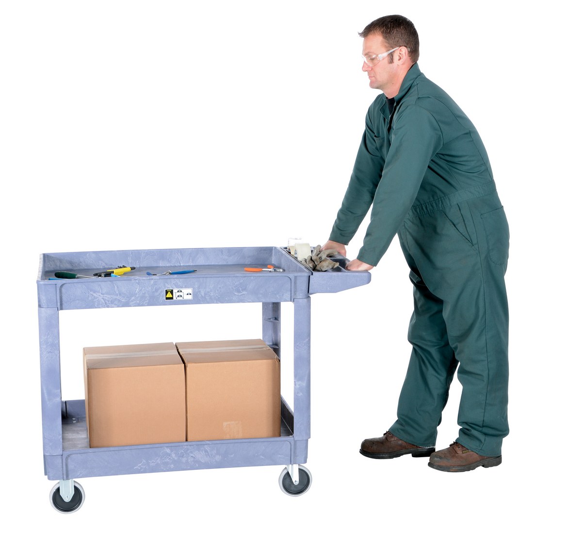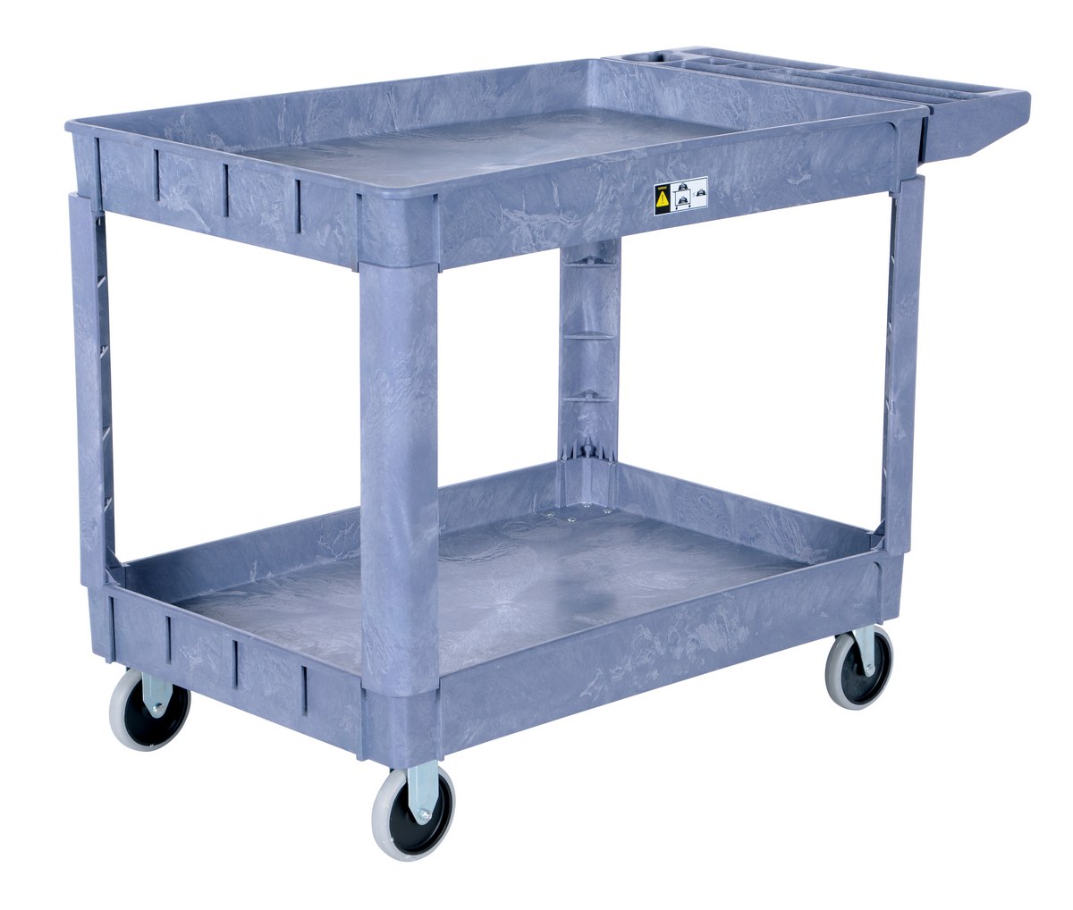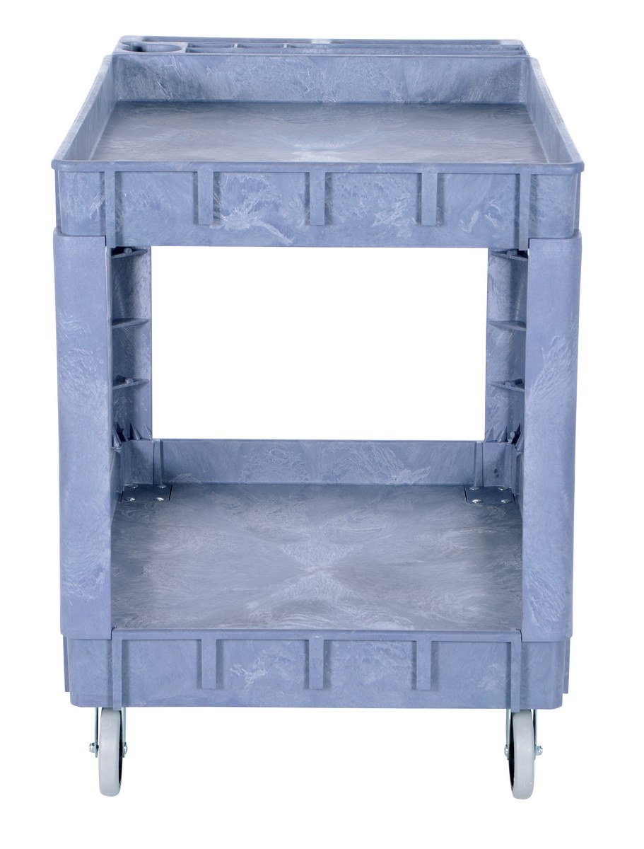 This plastic utility service cart is constructed from durable yet lightweight structural foam plastic. Choose the two (2) shelf design to accommodate your application. Deep lips prevent parts from rolling off. Ideal for mail rooms, shipping docks, grocery stores, warehouses, and inventory rooms.