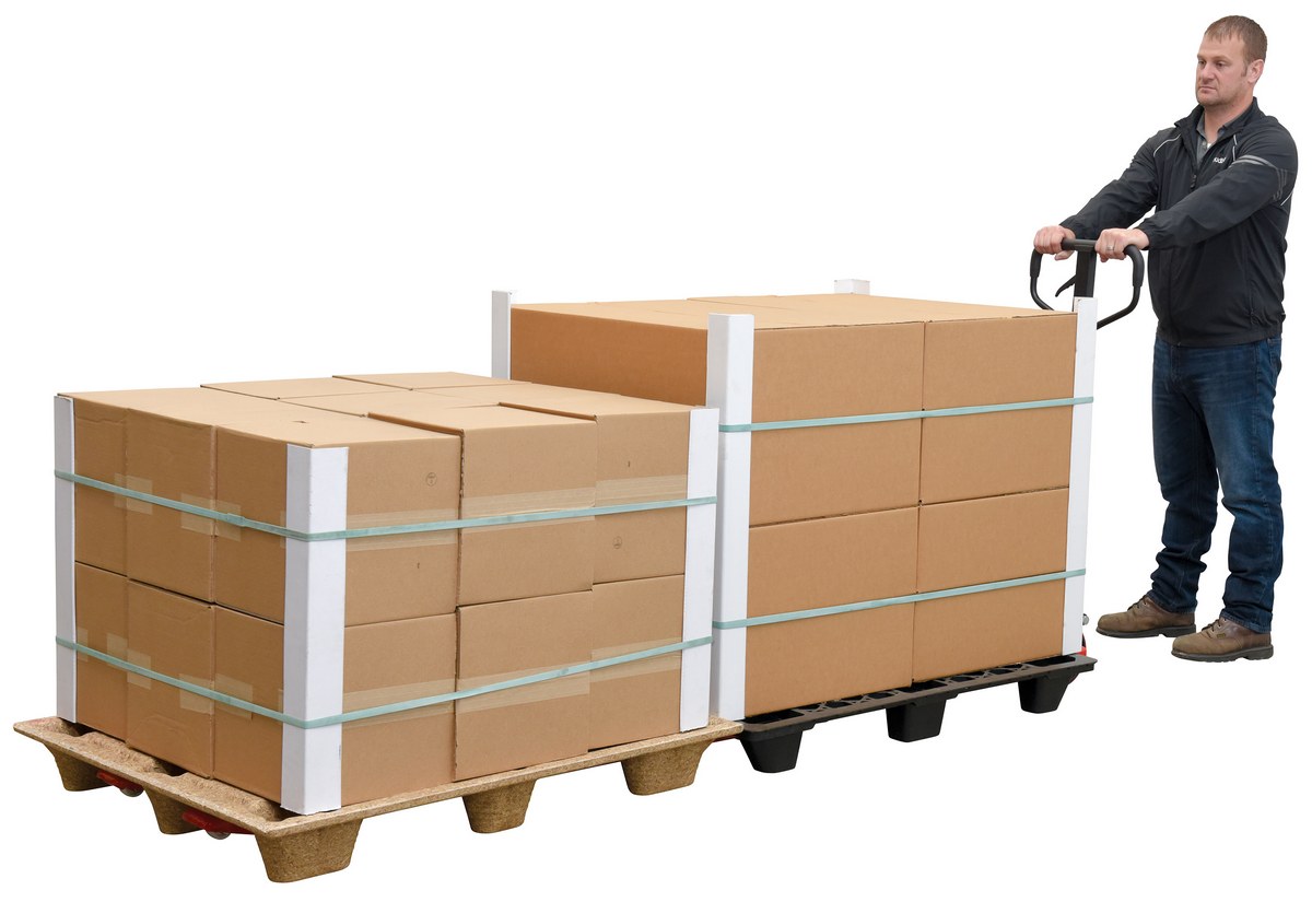 An economical way for one person to move heavy pallet loads without the use of a fork truck! Includes two articulating steering wheels and two front load rollers. Ergonomic design requires only 75 pounds of pulling force when fully loaded. Steering wheels include bearing dust covers for added life. Nose wheels are located on the front edge of each fork to assist in clean pallet entrance and exit. Reinforced triple-formed steel forks provide twice the strength of standard single-formed forks. Equipped with internally mounted solid steel adjustable push rods. Spring loaded handle automatically returns to vertical position when not in use. Hydraulic pump design facilitates easy-access seal replacement. Chrome-plated hydraulic pump piston for long seal life.