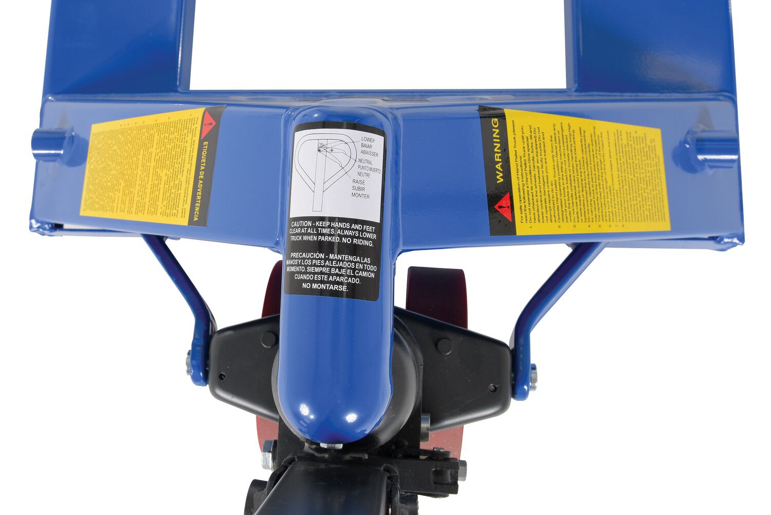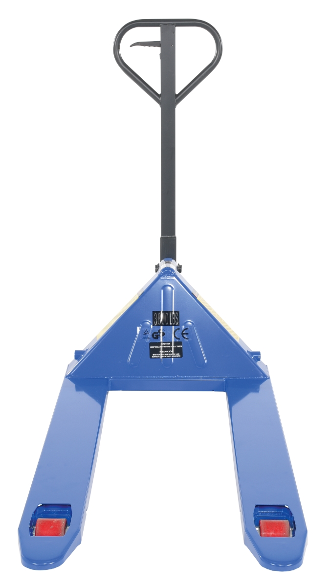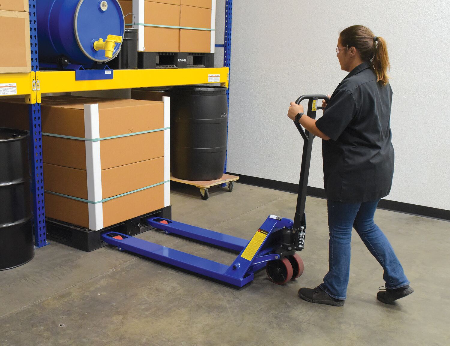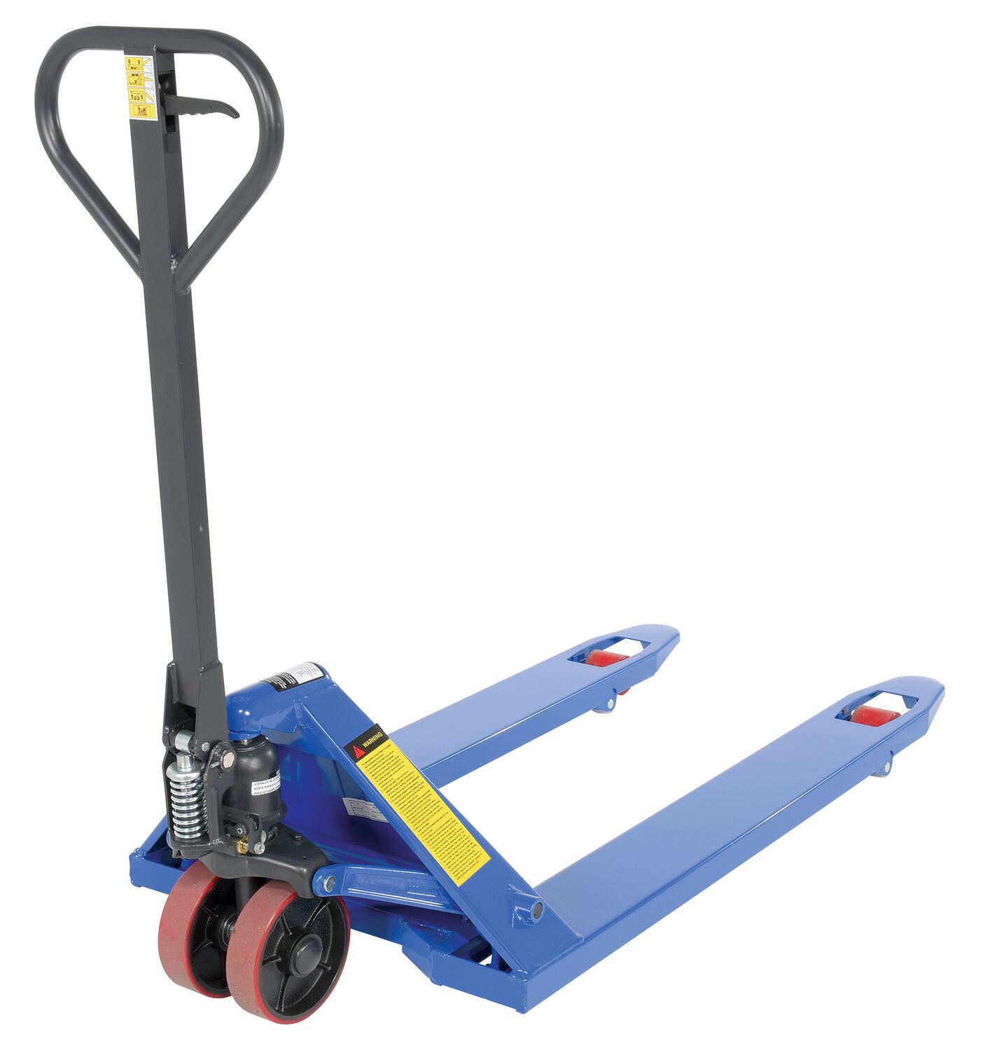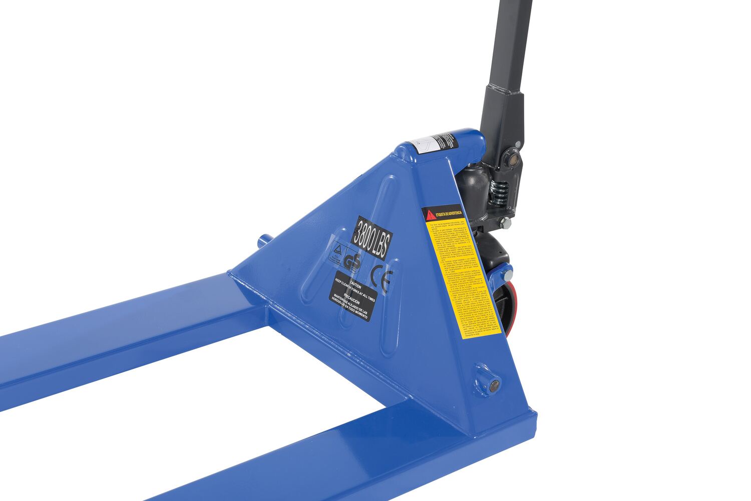 Steel Economy Hand Pallet Truck 64 In. x 27 In. x 48 In. 4000 Lb. Capacity BlueAn economy hand pallet truck is the perfect solution for moving heavy pallets and skids. With friendly design the unit is simply accessible for any maintenance or general upkeep needs. The hydraulic hand pump allows the user to more precisely raise and lower the unit to best fit the situation. A powder coated finish over a sleek steel construction bakes in added toughness.