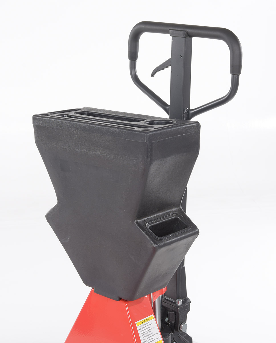 A pallet truck with a storage caddy is the perfect bundle of two innovative products. The pallet truck has an ergonomically friendly design with a limited pulling force required, while the caddy allows the user to be more organized and efficient. With a strong powder coated steel construction, the pallet truck moves easily between areas. Nose wheels are located on the front edge of each fork to assist in clean pallet entrance and exit. A molded plastic design allows the caddy to be durable throughout consistent daily use. Installation hardware and instructions included.