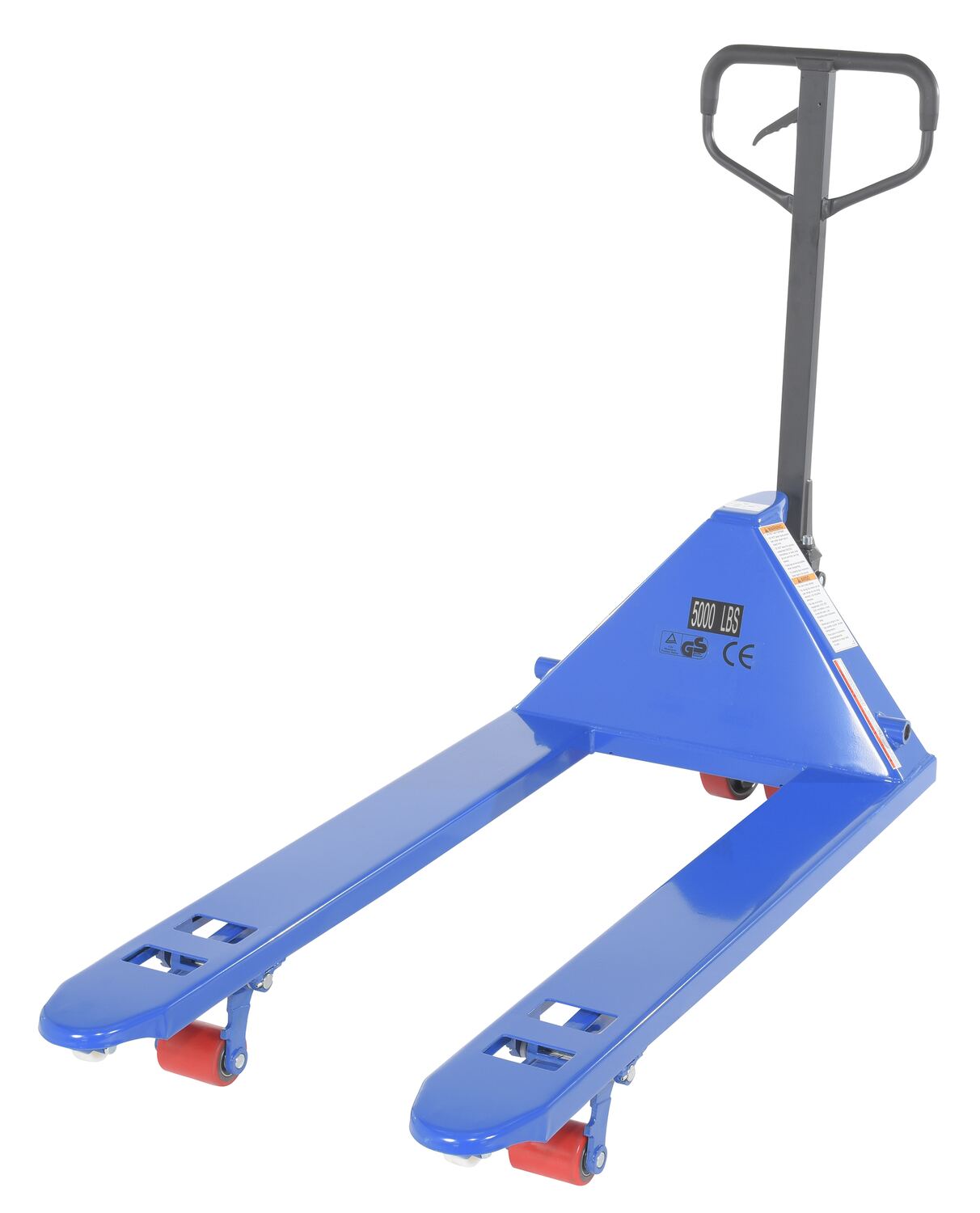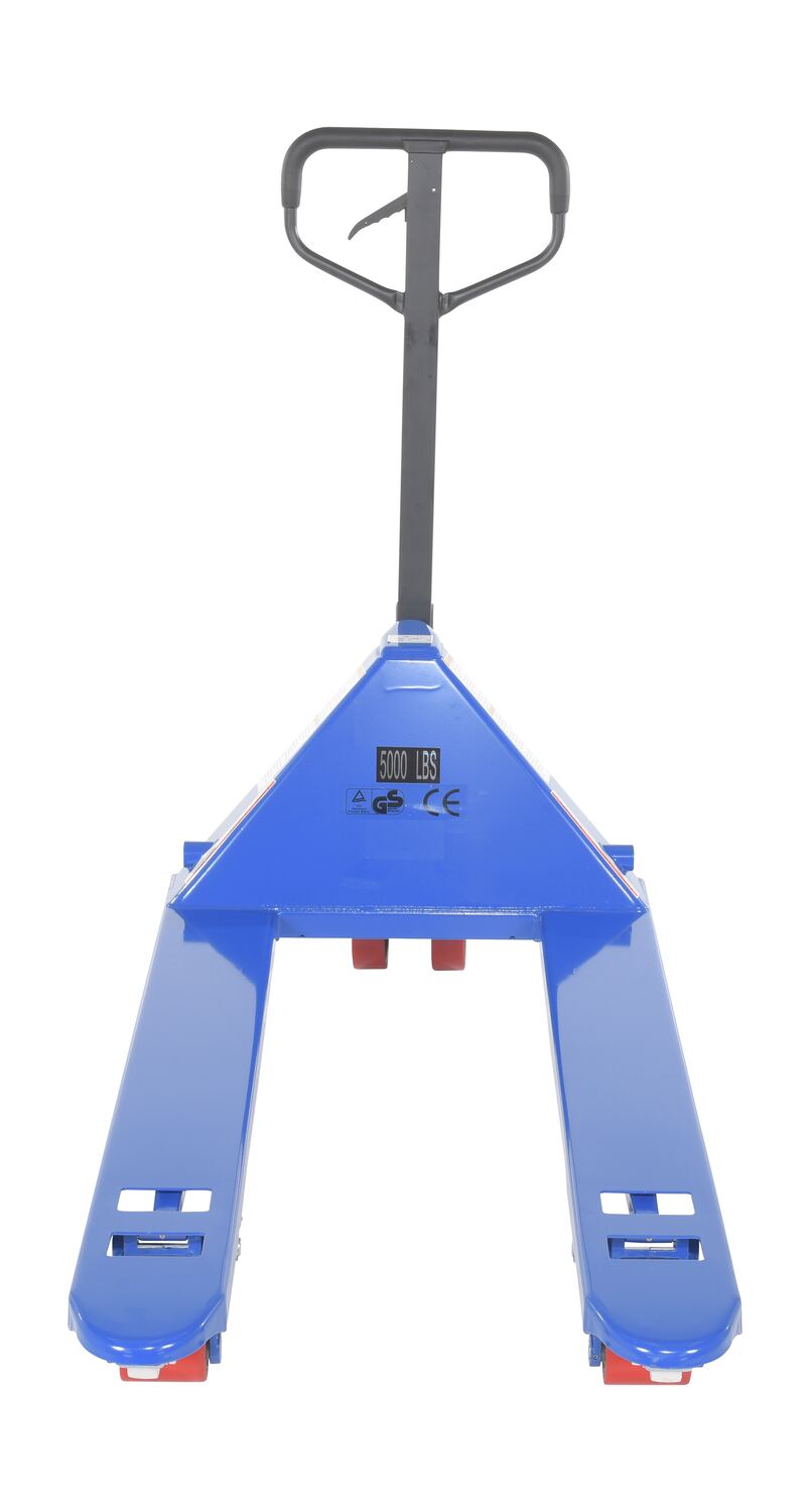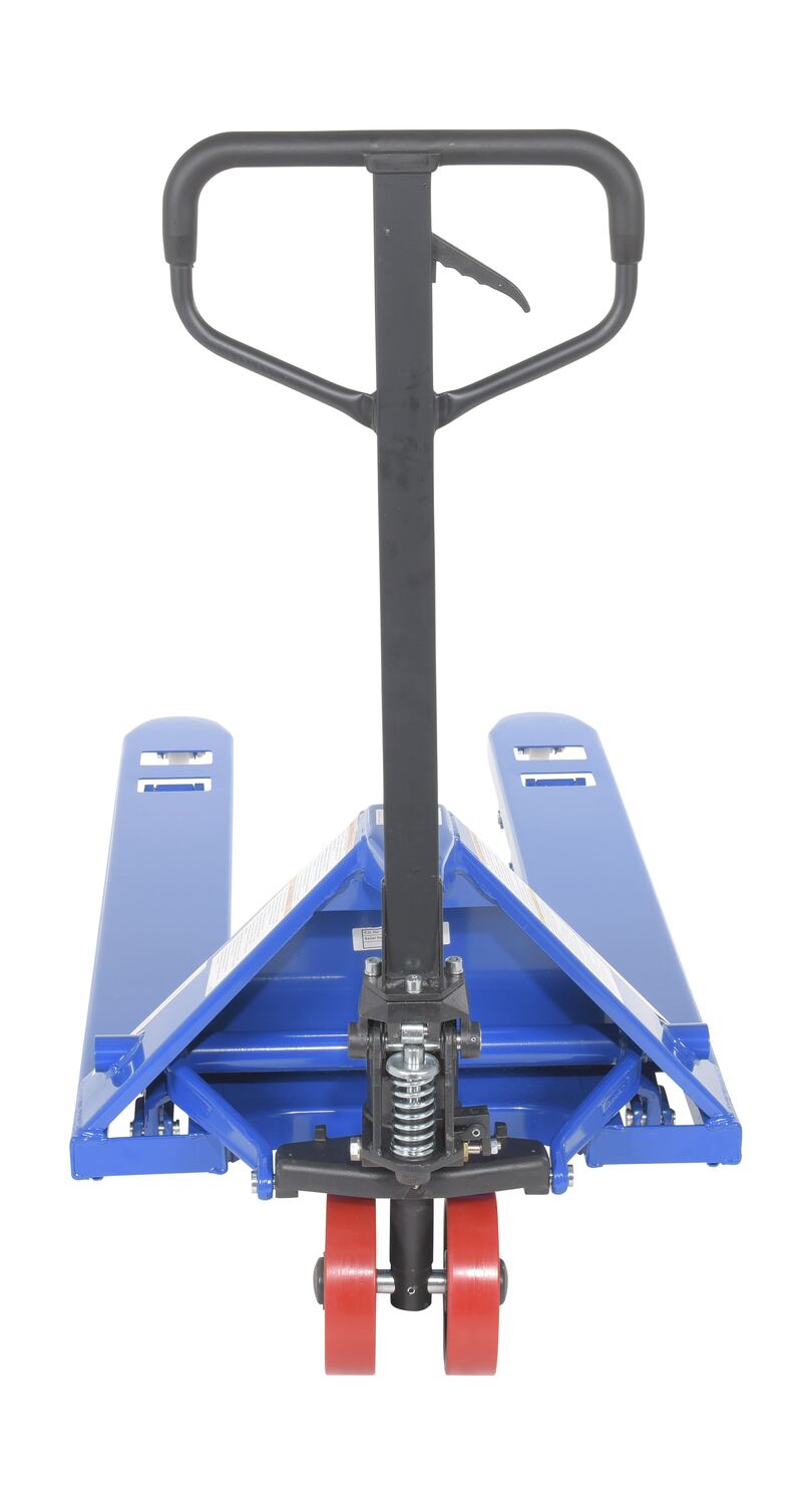 Steel Full Featured Pallet Truck 27 In. x 48 In. 5,000 Lb. Capacity BlueThe full featured pallet truck is an economical way for one person to move heavy pallet loads without the use of a fork truck! Includes two (2) articulating steering wheels and two (2) front load rollers. Reinforced triple-formed steel forks provide twice the strength of standard single-formed forks. The unit is equipped with internally mounted solid steel adjustable push rods. The spring loaded handle automatically returns to vertical position when not in use. Hydraulic pump design facilitates easy-access seal replacement.