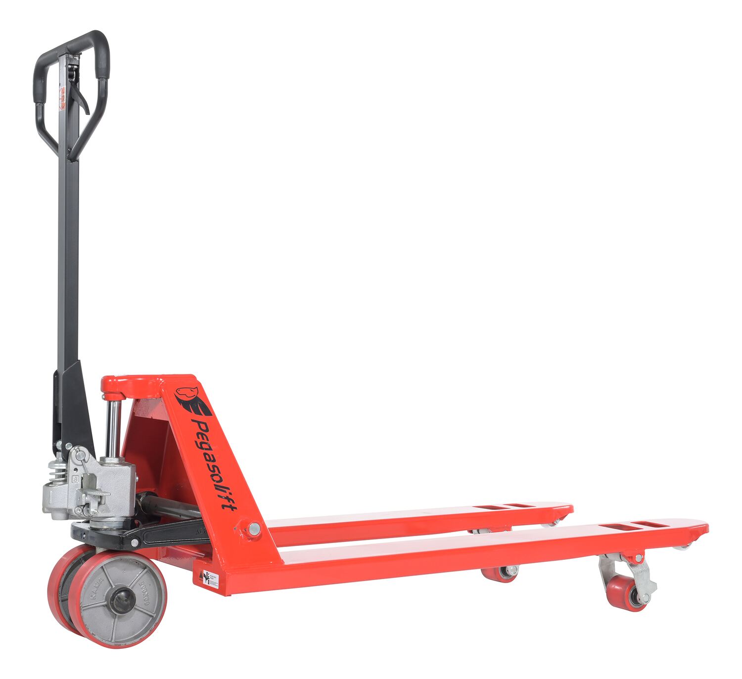Steel Pegasolift Manual Pallet Truck 27 In. x 48 In. 5,500 Lb. Capacity RedThe full featured pallet truck is an economical way for one person to move heavy pallet loads without the use of a fork truck! Includes two (2) articulating steering wheels and two (2) front load rollers. Nose wheels are located on the front edge of each fork to assist in clean pallet entrance and exit. The unit is equipped with internally mounted solid steel adjustable push rods. A chrome-plated hydraulic pump piston supports long seal life, while the hydraulic pump design facilitates simple seal replacement when needed.