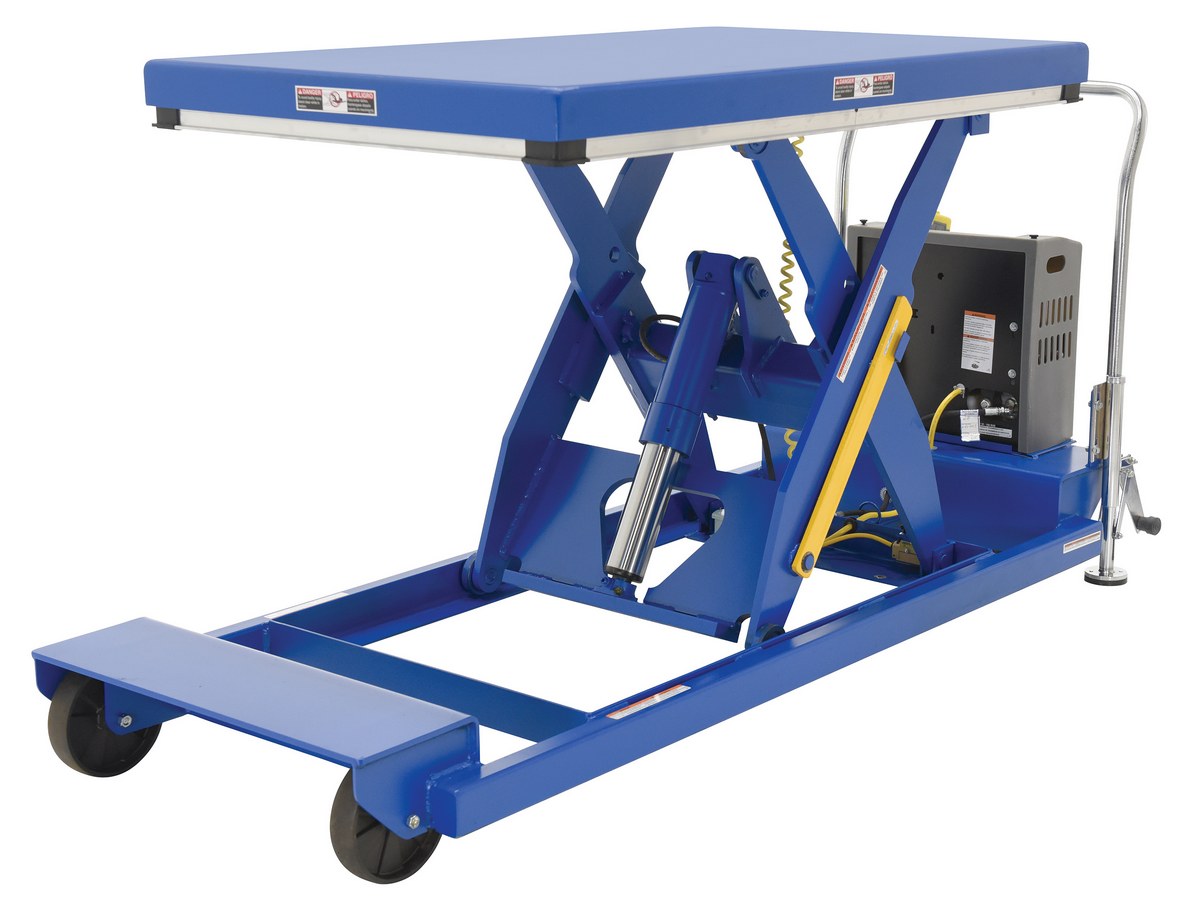 Steel Heavy Duty Portable Scissor Lift Table 46 In. 3000 Lb. Capacity BlueHeavy Duty portable lift scissor tables can easily transport and elevate heavy loads. Featuring glass nylon filled casters (2 swivel and 2 rigid), floor lock, patented electric pinch point guards, and magnetic hand controls. Key-operated on/off control for better security is built into the power unit. Heavy duty 12V DC powered unit with deep cycle battery, an on-board battery charger and battery charge indicator gauge comes standard.