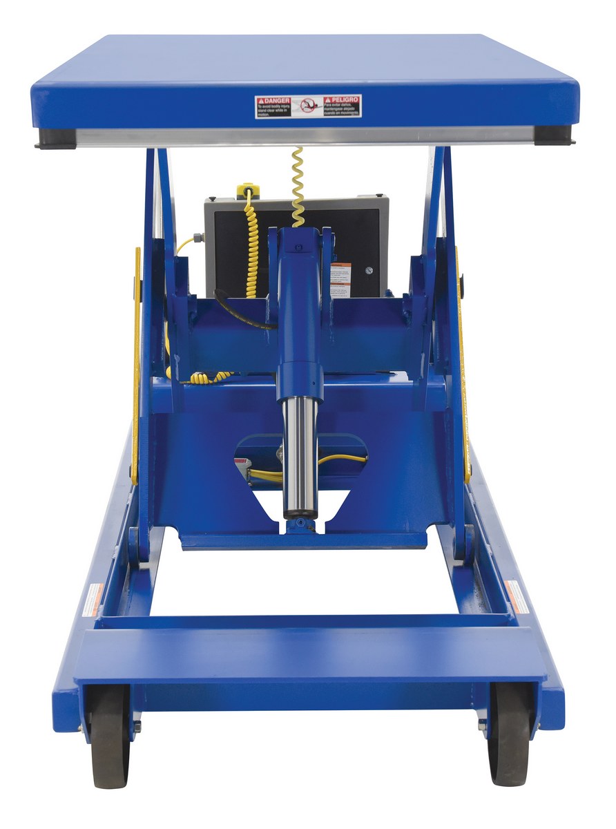 Heavy Duty portable lift scissor tables can easily transport and elevate heavy loads. Featuring glass nylon filled casters (2 swivel and 2 rigid), floor lock, patented electric pinch point guards, and magnetic hand controls. Key-operated on/off control for better security is built into the power unit. Heavy duty 12V DC powered unit with deep cycle battery, an on-board battery charger and battery charge indicator gauge comes standard.