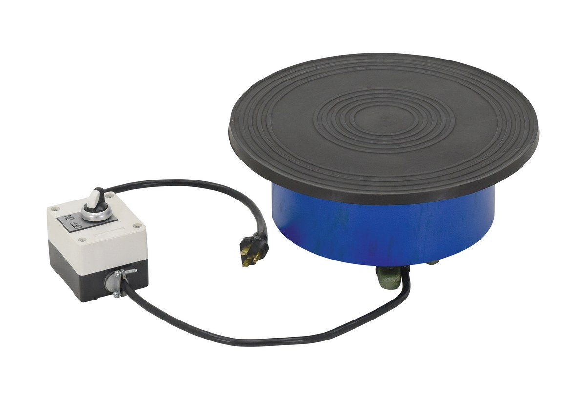 Steel Clockwise Powered Turntable 12 In. x 12 In. x 5-1/32 In. 100 Lb. Capacity BlueThe powered turntable helps keep tedious material handling at your fingertips. Easy, smooth, clockwise rotation for hundreds of applications. An on/off selector switch is incorporated with a cord that provides power to the unit. A side skirt to protect items from getting into the rotating mechanism is standard.