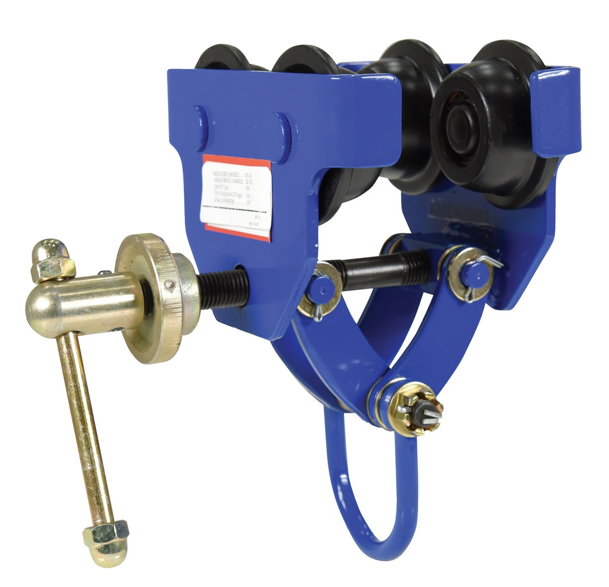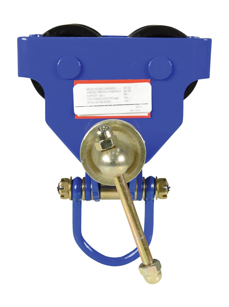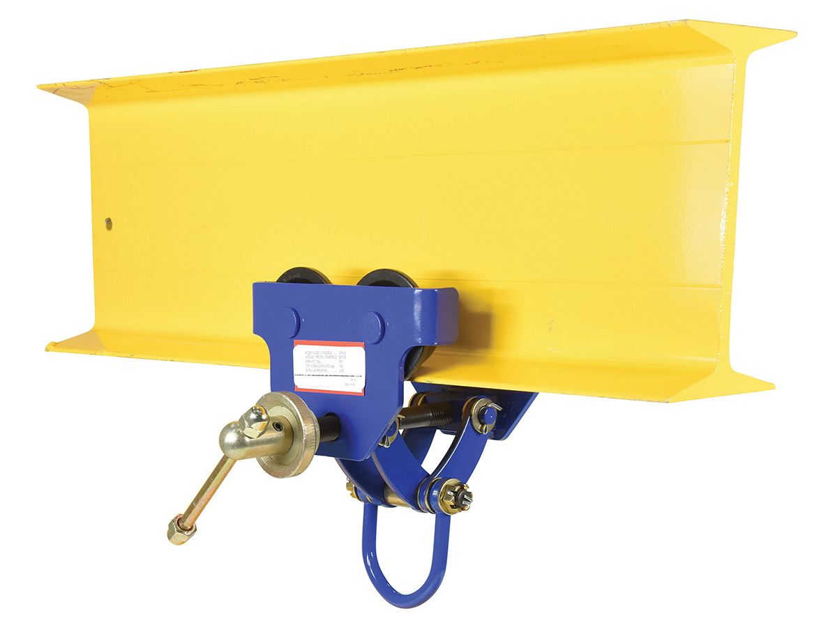 Steel Quick Install Manual Trolley 6-3/4 In. x 11-3/4 In. x 10-1/4 In. 300 Lb. Capacity BlueThis quick install manual trolley is dependable, easy and safe to use. Designed to easily adjust to the width of virtually any S, H, W and M type I-beam. Width is adjusted with manual screw mechanism. Includes locking ring to prevent trolley width from changing accidentally. Manual screw mechanism may also be tightened to prevent trolley from moving (similar to a beam clamp). Each trolley includes four (4) rollers with sealed bearings for long life. A lifting eye is located at the bottom of the trolley for attaching a hoist (not included).