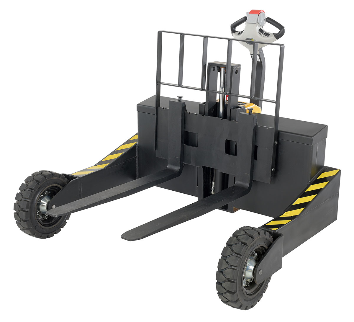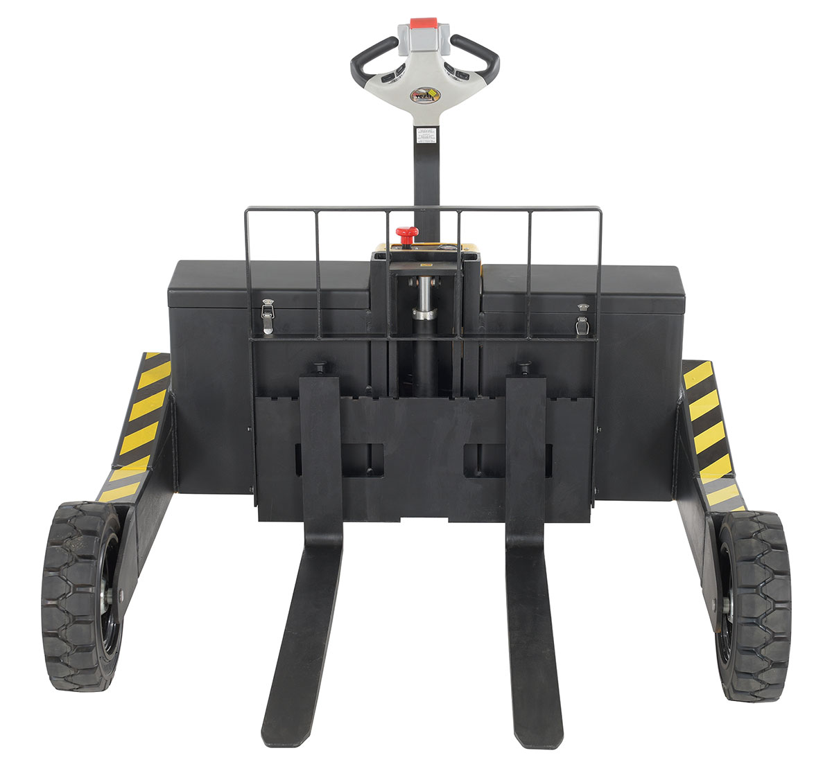 Steel Rough Terrain Electric Pallet Truck DC Powered AC Drive Motor 48 In. Inside Width 3000 Lb. Capacity Black / YellowAn all-terrain pallet truck is the perfect outfit for moving heavy loads over a variety of landscapes. The simple functionality of the unit allows the user to maneuver the truck, both loaded and unloaded, easily. Driving handle is centrally located and other functions, such as a horn, are placed just underneath the handle on the front console of the unit. Forks are adjustable to best fit the users needs.