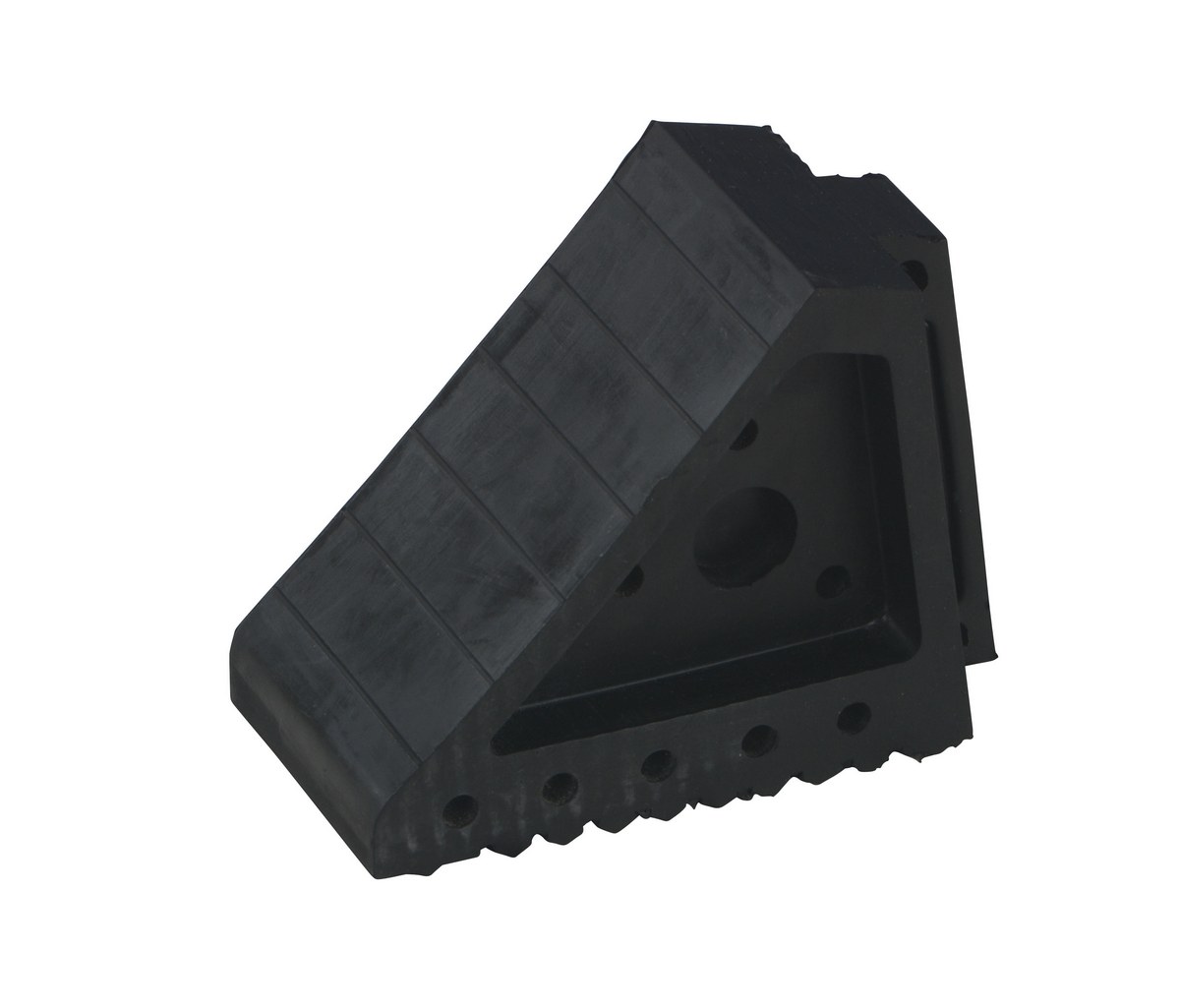 The rubber wheel chocks are constructed of reinforced rubber to provide a sure grip on virtually any surface. The curved surface contours to fit tires. Rubber resists tearing, abrasion, ozone weathering, etc. The functional design is durable in all weather conditions.