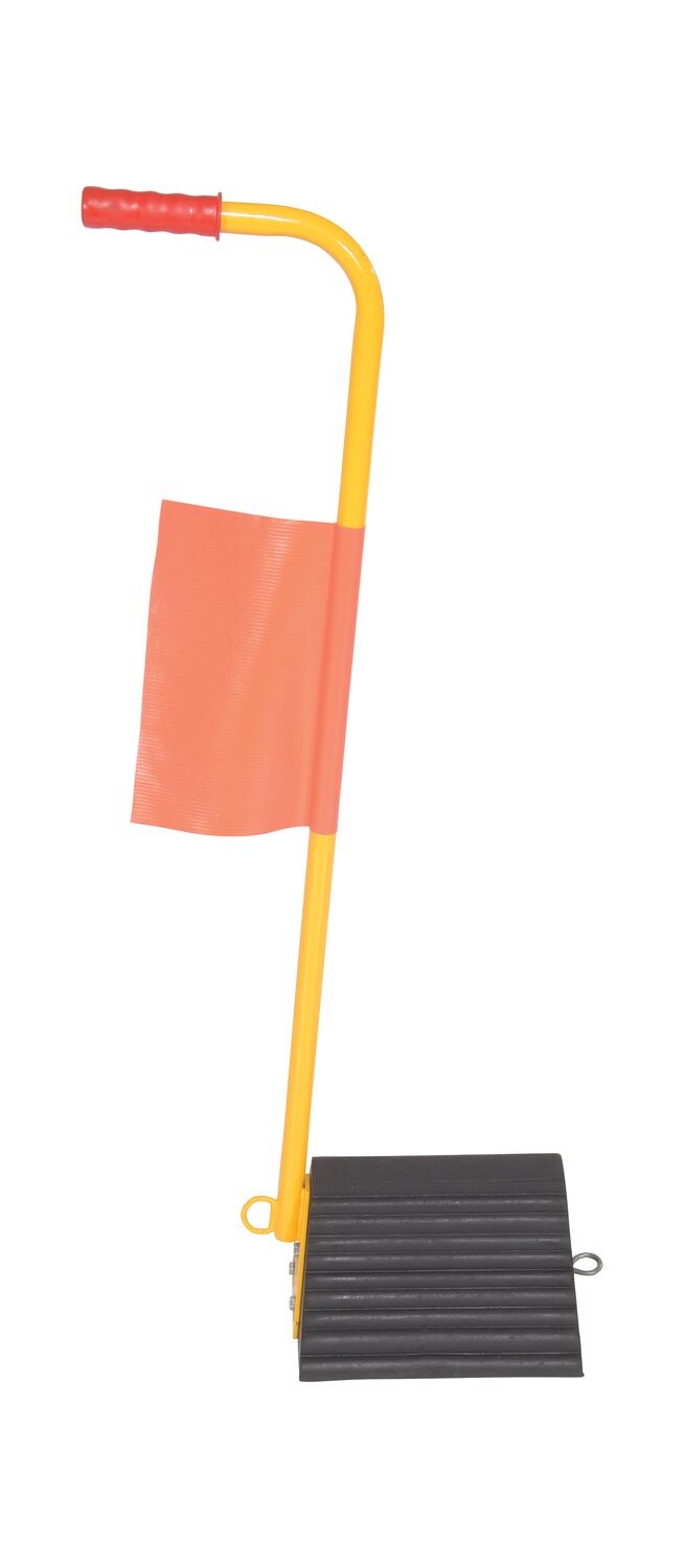 The ergo-handle Wheel Chock has an ergonomic design that makes it easy to move wheel chocks in and out of position under trailer wheels. It reduces the risk of back, knee, and foot injuries. The handle is constructed of steel and has a yellow powder coat finish. Hardware included. Assembly required. D-ring provided for attaching security chain. A vinyl flag is included to provide added visibility and awareness to the chock. Chain not included.