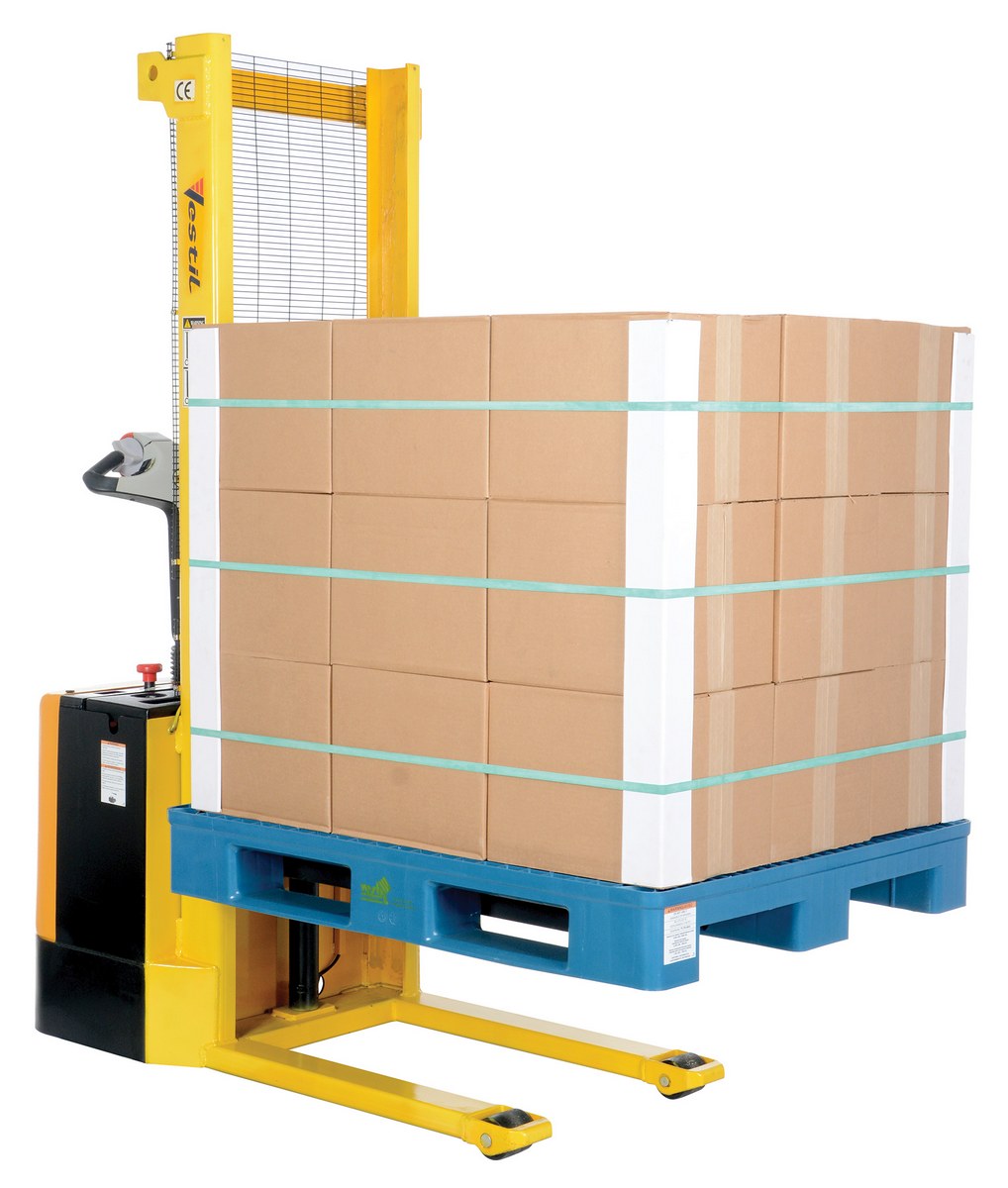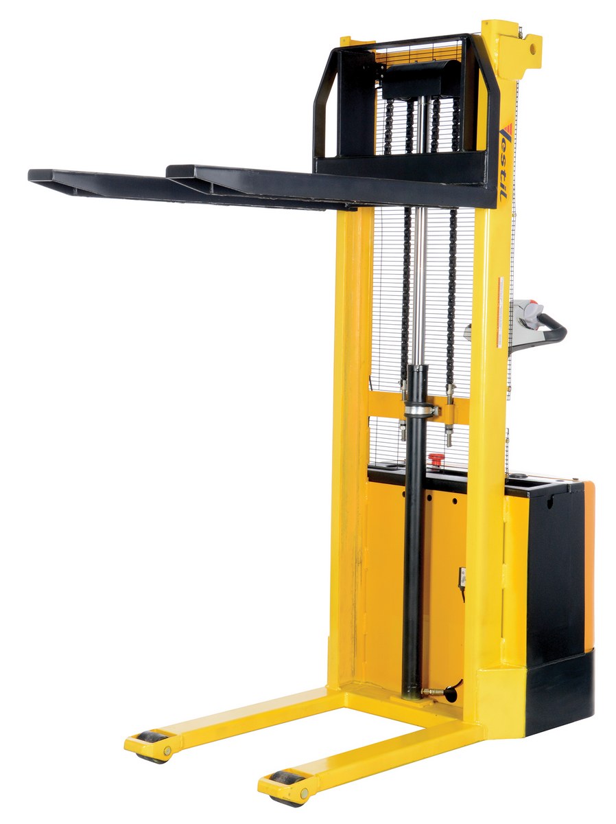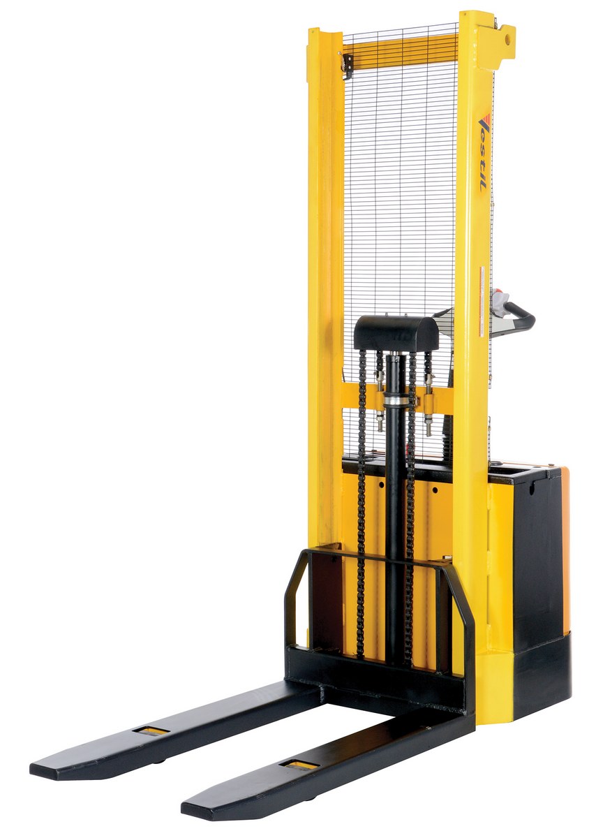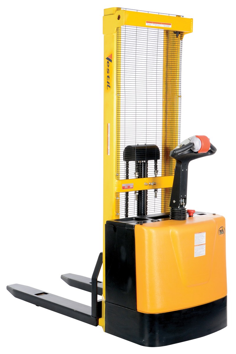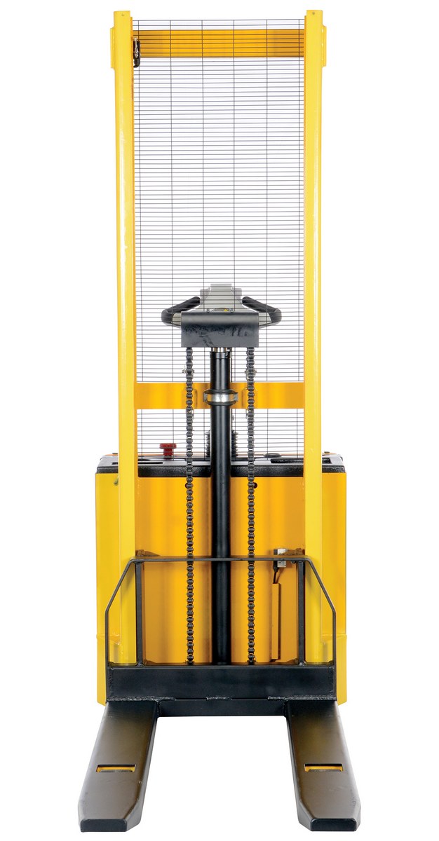 Steel Fixed Powered Lift Stacker 62 In. Raised Height 2,000 Lb. Capacity Black / YellowThe stacker with powered drive and powered lift is a fully powered electric stacker that transports loads throughout warehouse facilities quickly and with less effort. The high torque drive and lift motor handles heavy-duty jobs. The ergonomic handle features easy-to-operate throttle with infinite adjustment of forward and reverse speeds, lift/lower controls, proprietary safety-enhancing emergency reverse function, and horn. When the proprietary safety-enhancing emergency reverse function is actuated, the emergency reverse belly switch instantly reverses direction and moves the unit forward (away from the operator) until the switch is released or after five seconds have elapsed. The built-in safety circuit will automatically disable the entire unit if the emergency reverse belly switch is activated for more than five (5) seconds after which the unit must be re-set to return to normal operating conditions. This state-of-the-art safety device provides a high degree of operator protection. It includes an electromagnetic disc brake with automatic dead-man feature that activates when user releases the handle. The power lifter features a lead acid deep cycle battery, integral battery charger, and a battery level gauge. The stacker rolls smoothly on poly-on-steel steer and load wheels.