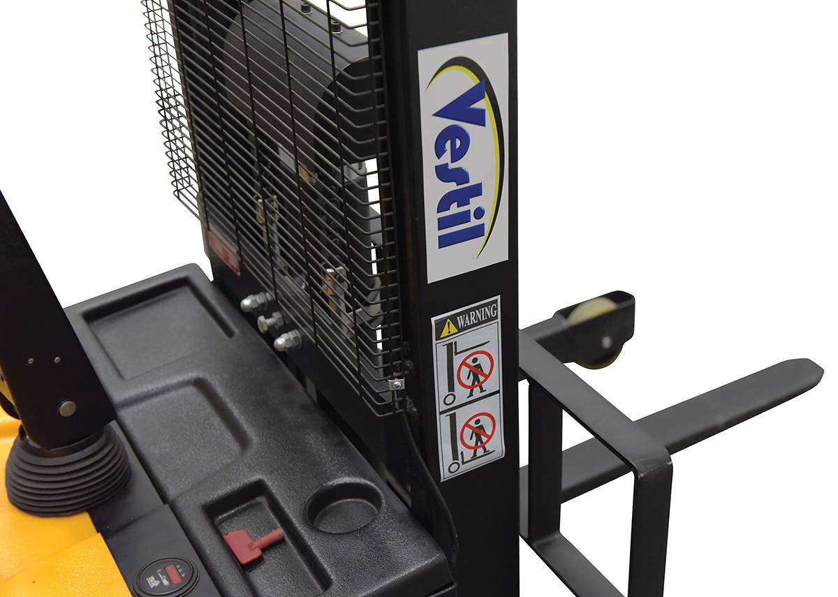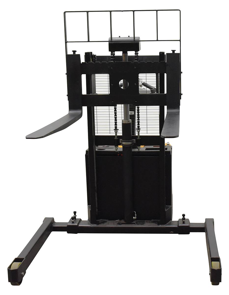 A fully powered electric stacker transports loads throughout warehouse facilities quickly and with ease. Ergonomic handle features lift/lower controls, adjustable forks/adjustable legs and horn Stackers can be easily maneuvered in condensed areas where space is limited. Steel construction with a powder coated for built in toughness. Horn included.