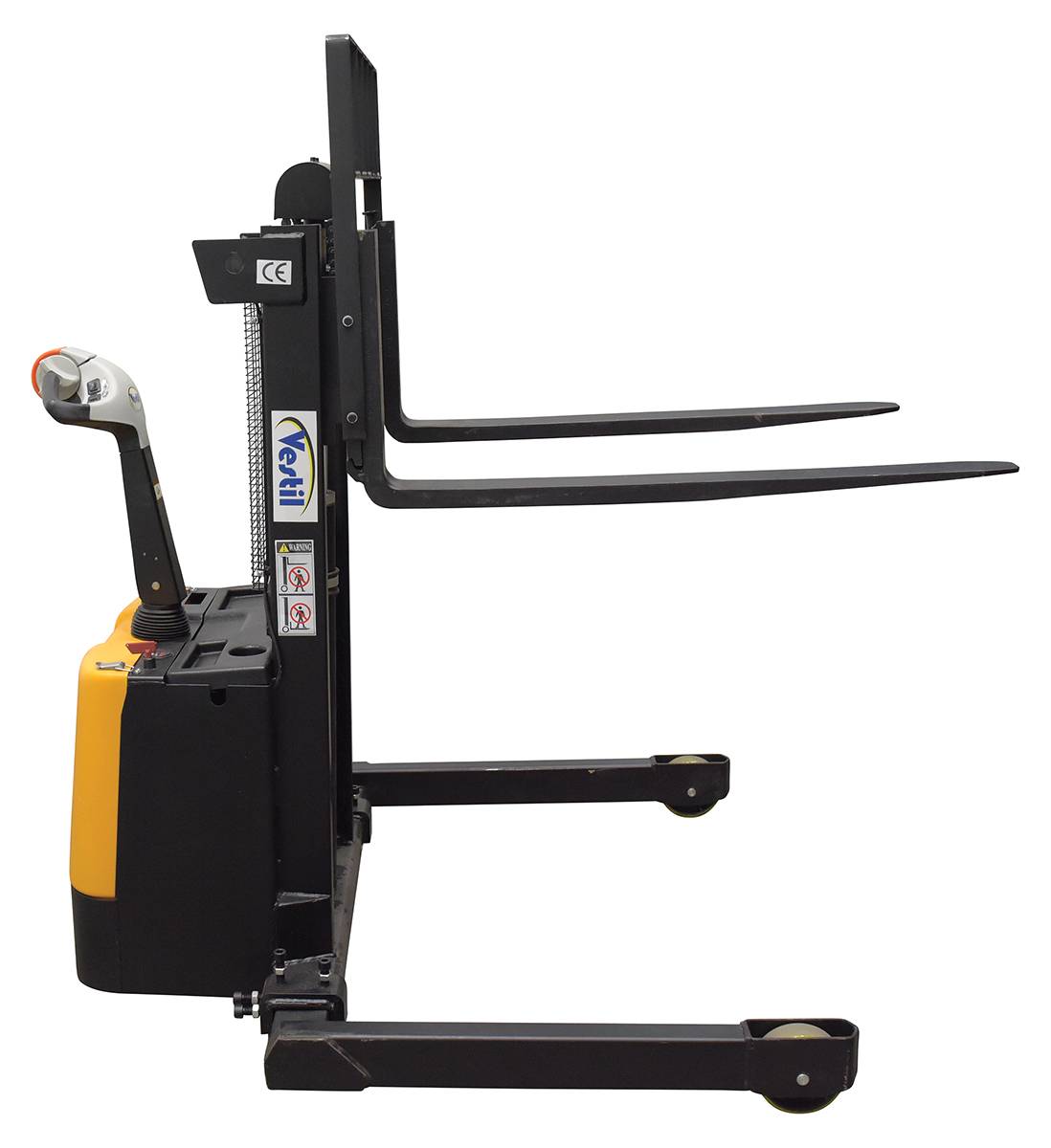 Steel Adjustable Double Mast Stacker 43 In. Raised Height 3,000 Lb. Capacity Black / YellowA fully powered electric stacker transports loads throughout warehouse facilities quickly and with ease. Ergonomic handle features lift/lower controls, adjustable forks/adjustable legs and horn Stackers can be easily maneuvered in condensed areas where space is limited. Steel construction with a powder coated for built in toughness. Horn included.