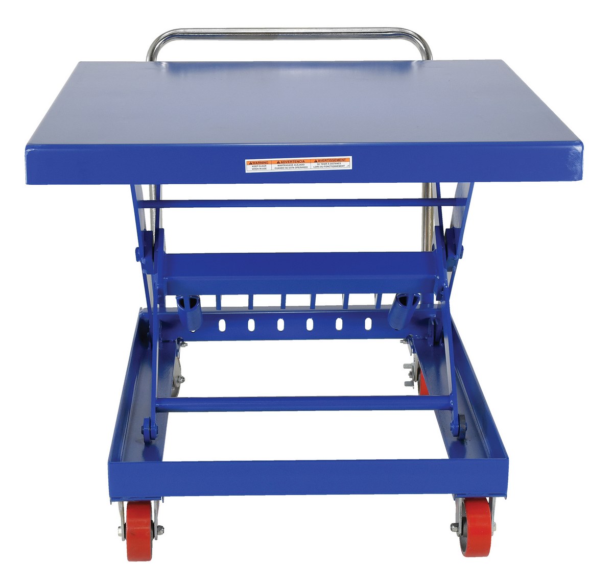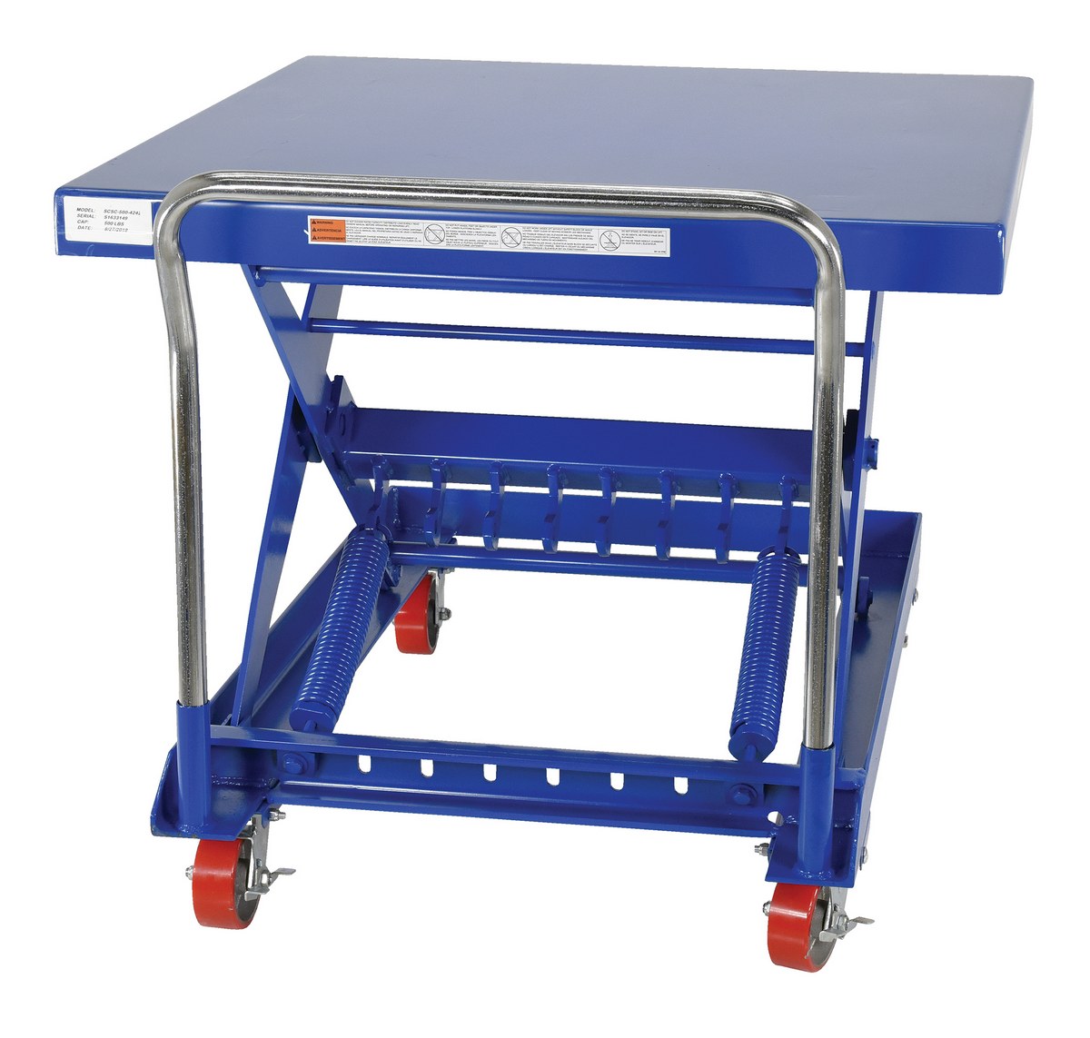 Steel Auto Hite Cart 47 In. x 42 In. x 37-5/8 In. 500 Lb. Capacity BlueThe auto-Hite cart raises and lowers as materials are removed or added to the platform, keeping material at an ergonomic work height. It increases efficiency while reducing potentially harmful bending and twisting motions. Carts utilize tension springs which can be adjusted in order to fit each particular application. The unit has an all steel construction with a removable handle and rolls smoothly on polyurethane casters, two (2) rigid, and two (2) swivel with brake.