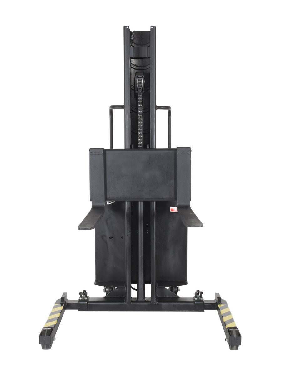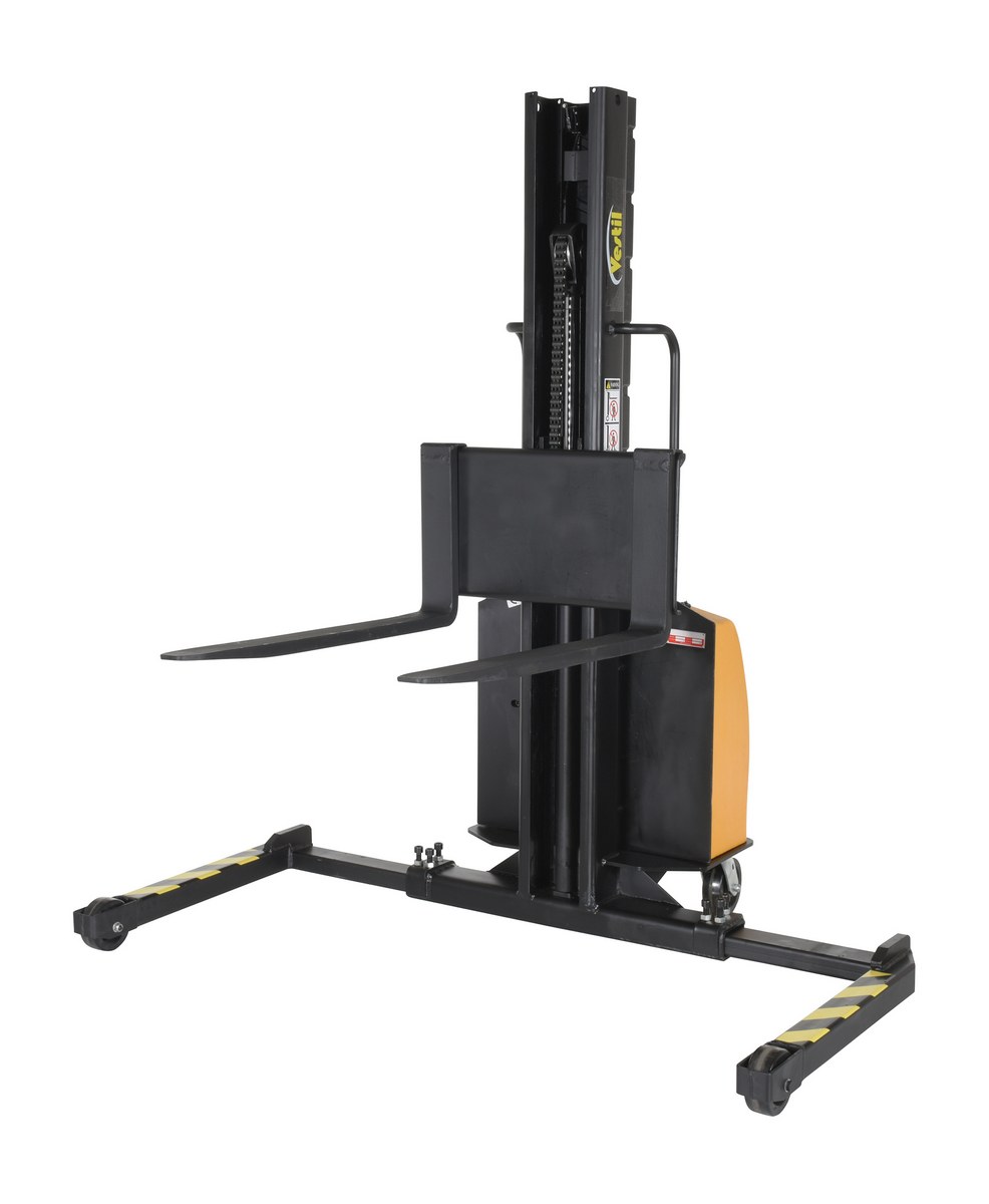 Steel Narrow Mast Stacker DC Powered 63 In. Raised Height Adjustable Forks and Support Legs 1,500 Lb. Capacity YellowThe narrow mast stacker is great for the shipping and manufacturing facilities. The stacker provides a fast efficient solution to loading and unloading products in closely confined areas. The unit features a simple push button design for lifting control, nylon steering and load wheels for excellent maneuverability, and a battery charger and gauge. Models are available with fixed or adjustable forks as well as fixed or adjustable leg supports.