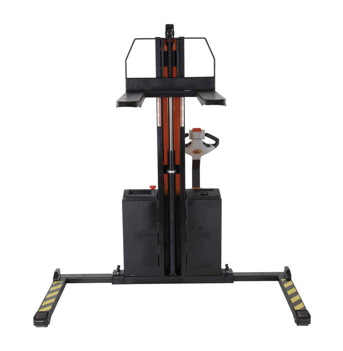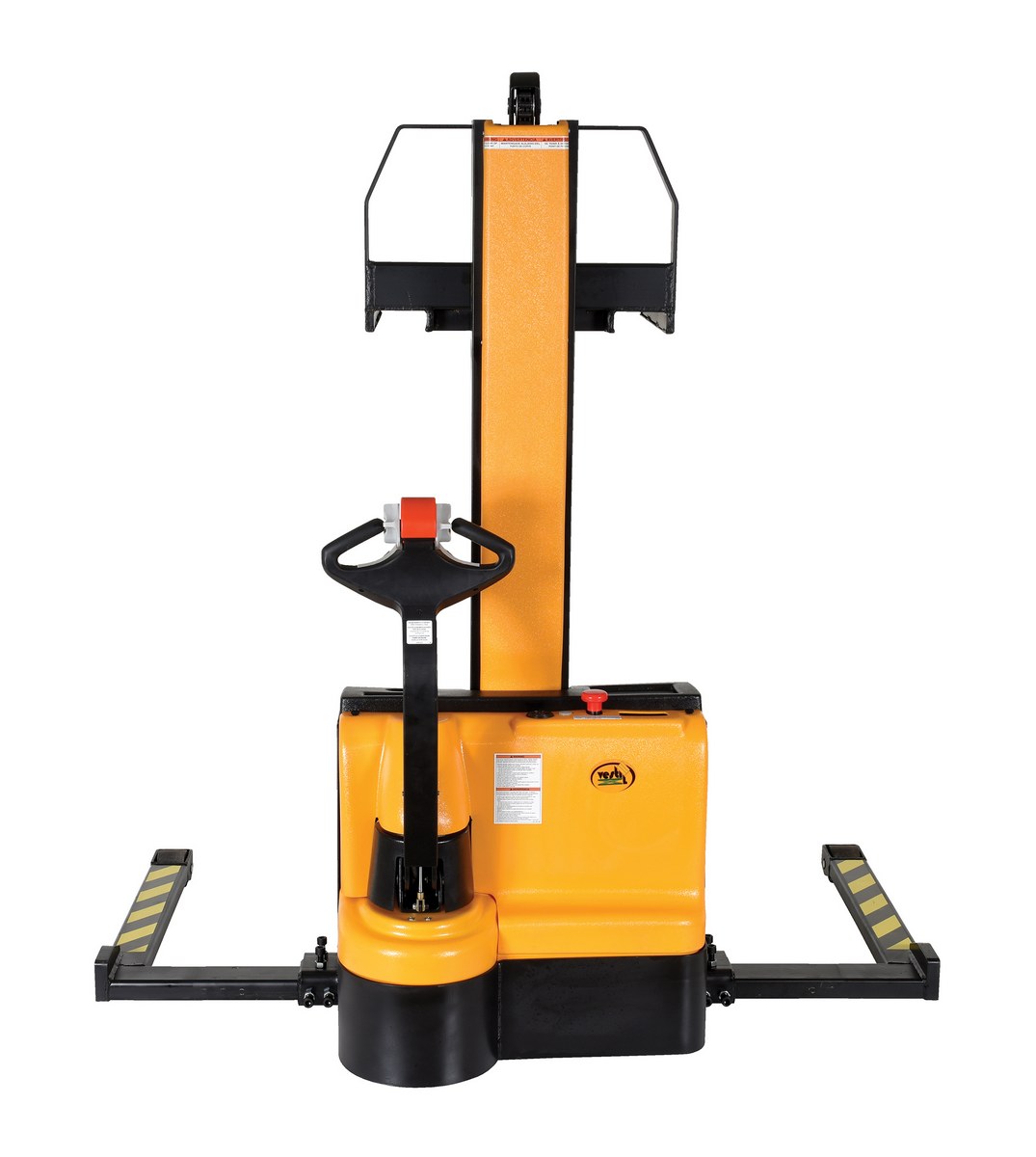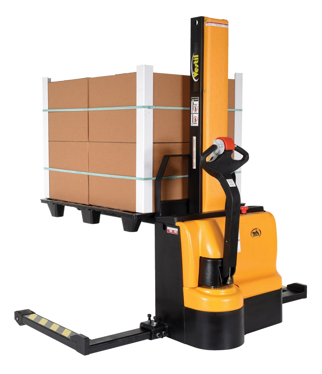Steel Narrow Mast Stacker DC Powered 62 In. Raised Height Fixed Fork Adjustable Support Legs 2,200 Lb. Capacity Black / YellowThe narrow mast stacker is great for the shipping and manufacturing facilities. The stacker provides a fast efficient solution to loading and unloading products in closely confined areas. The stacker features a simple throttle design for lifting control, as well as, infinite forward and reverse speed adjustments. The unit drives on poly on steel steering and load wheels, which provide excellent maneuverability. A battery charger, gauge and horn are included. Models are available with fixed or adjustable forks as well as fixed or adjustable leg supports.