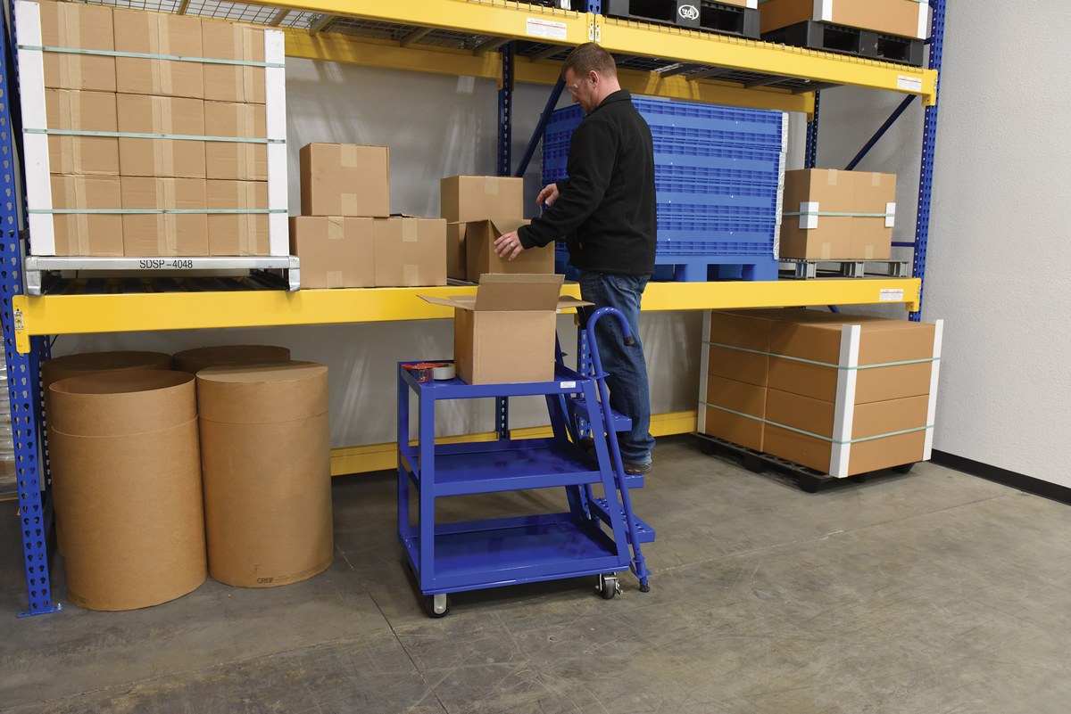 Steel Stock Picker 3 Shelf with Mold On Rubber Casters 39-3/4 In. x 21-7/8 In. x 50-1/8 In. 1,000 Lb. Capacity BlueCombine the mobility of a cart with the versatility of a step ladder with this stock picker truck. Convenient spring loaded steel step ladder holds the cart securely in place while a person is standing on the ladder. Crutch tip ladder prevents the cart from moving while stocking. Springs then return the ladder to the raised position once personnel exit the step. All shelves have the lip turned up to prevent items from falling off.