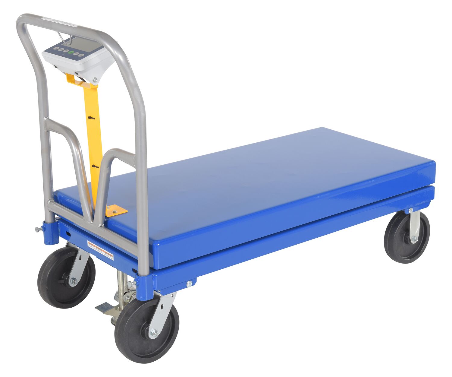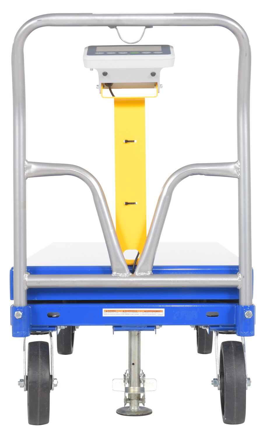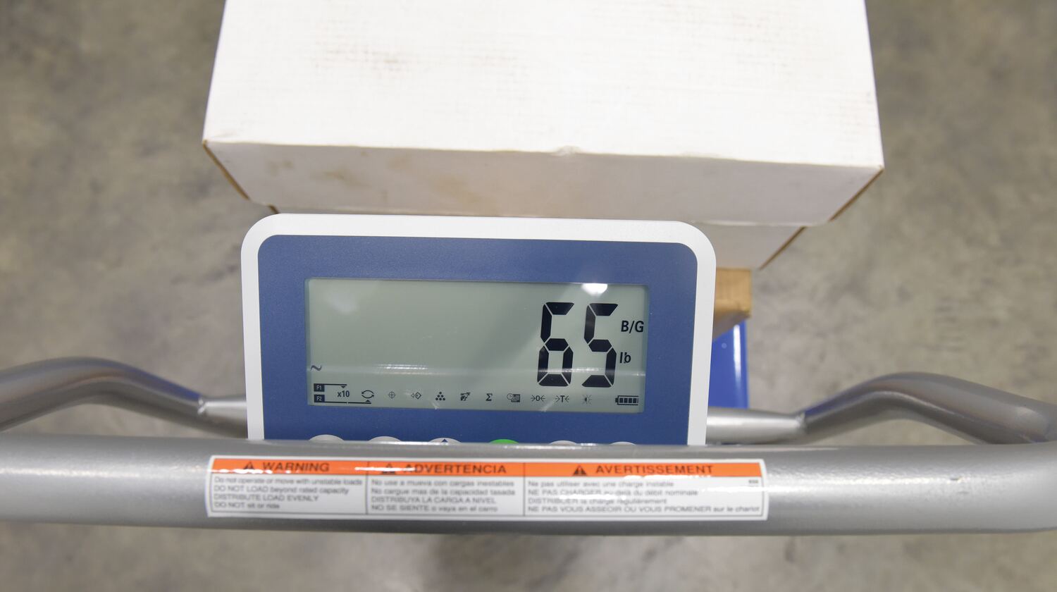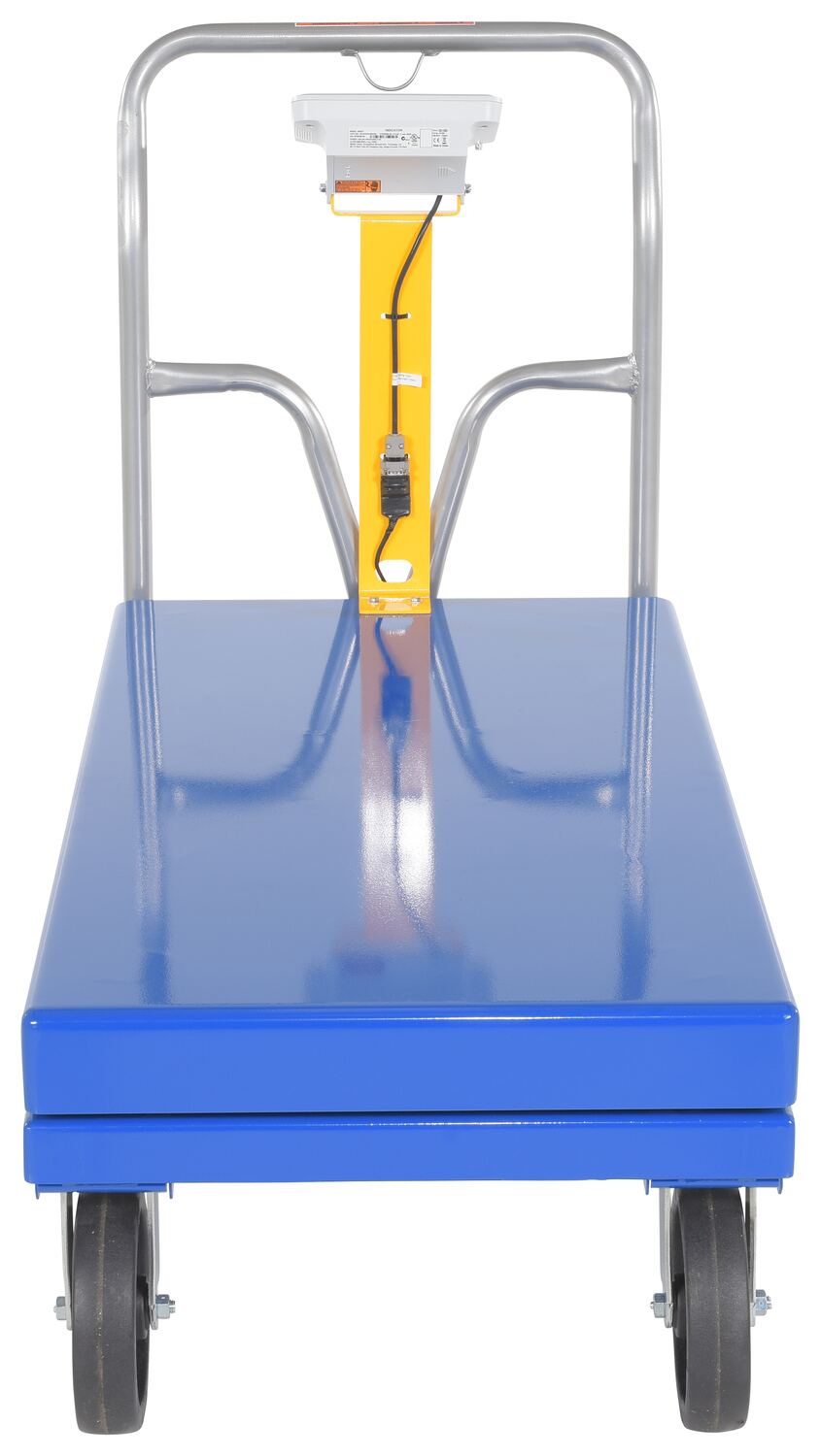 Steel Platform Truck with Scale 53-7/8 In. x 24 In. x 40 In. 3,600 Lb. Capacity BlueThis steel Platform Truck with solid, smooth deck, features structural reinforcement underneath for extra strength. Includes one (1) removable high-polished steel handle and a functional scale. The scale gives users the ability to weigh items during picking rather than in congested designated shipping areas. The readout screen sits atop a built in pedestal, centrally located under the handle. Durable blue powder coat finish.
