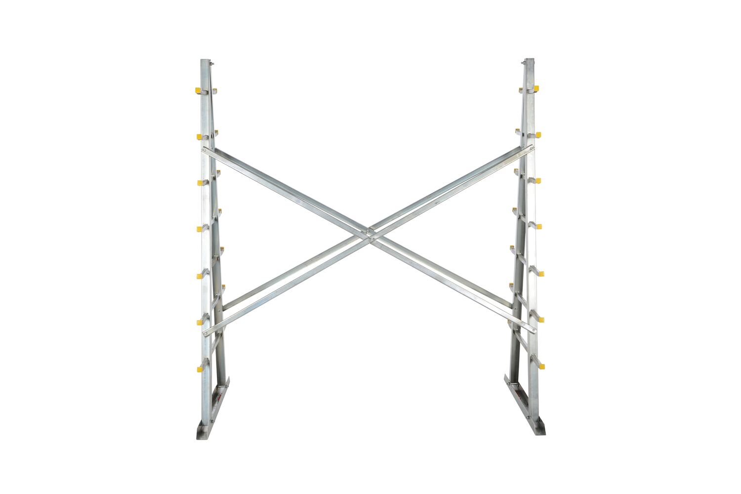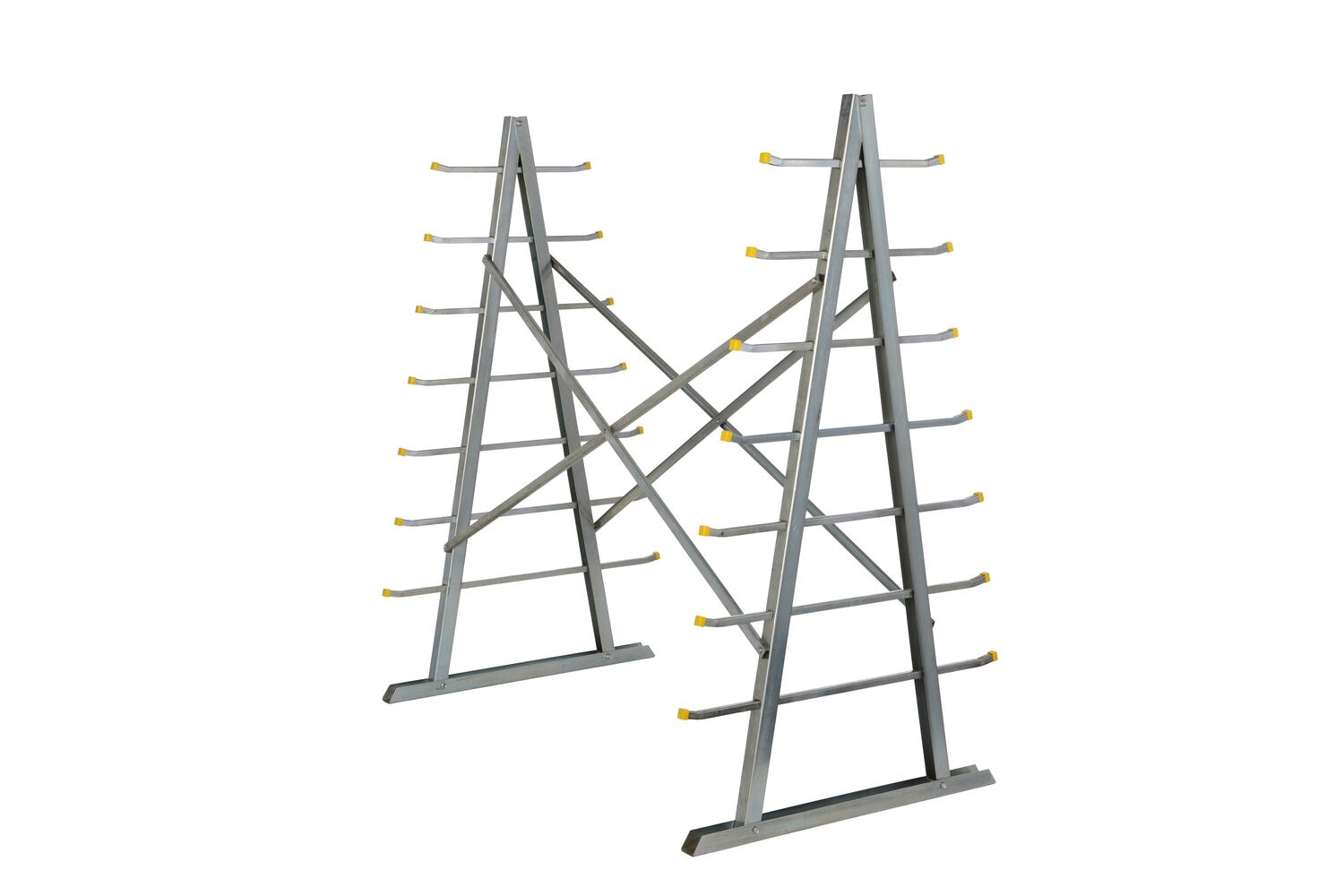Steel Self Supporting Rack 36 In. x 60 In. x 66 In. 2,000 Lb. Capacity SilverA self-supporting 66" high A-frame with 7 storage levels. Arms extend up to 12" beyond A-frame. Base dimensions are 60" by 36". Rack must be statically and uniformly loaded, up to had the total system capacity per side. Each support arm must also be statically and uniformly loaded. Shipped knocked down with convenient and quick assembly. Bright zinc plated finish.