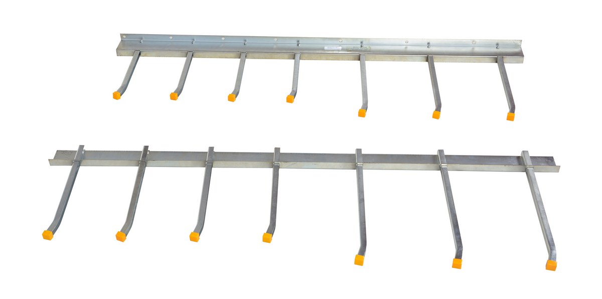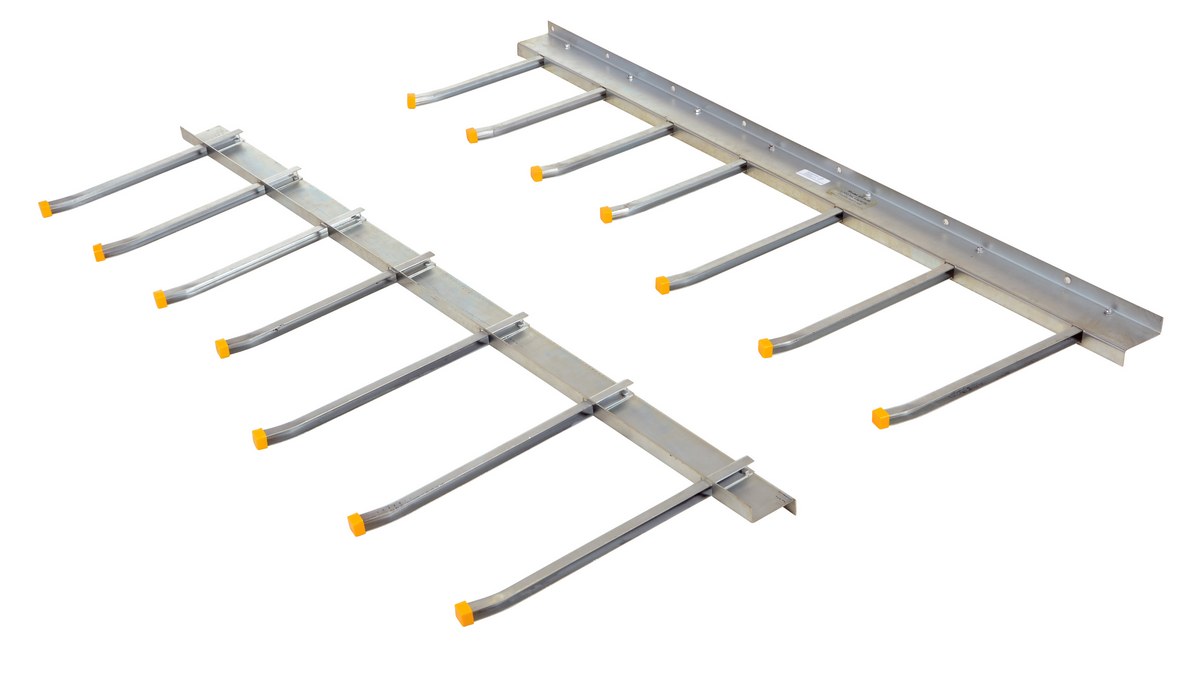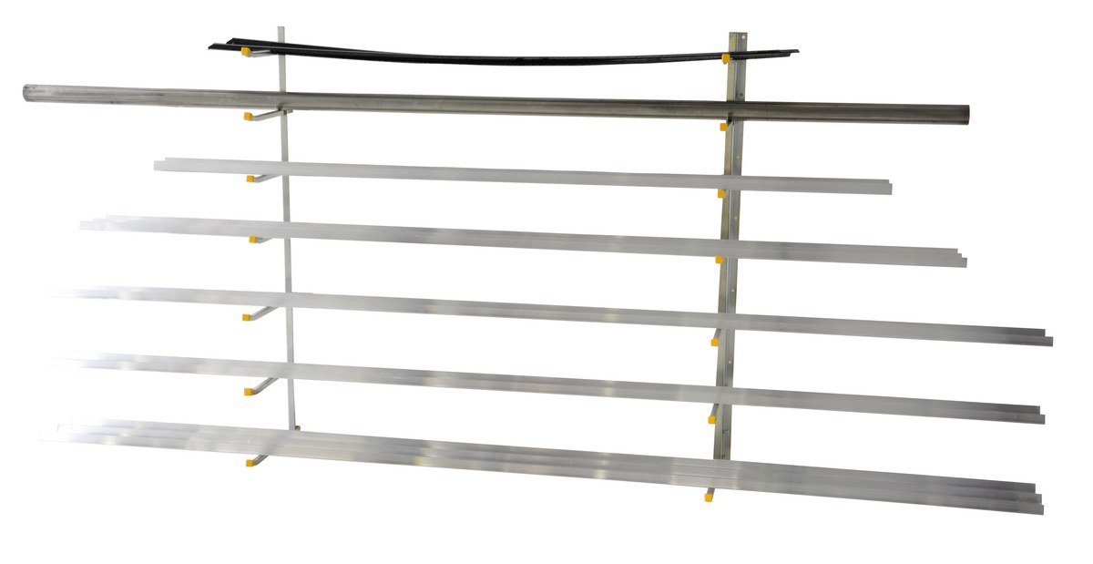 This economical material rack is a wall mounted unit with dual supports. It comes with three (3) long arms and four (4) short arms. The bright zinc plating provides a long term, attractive appearance.
