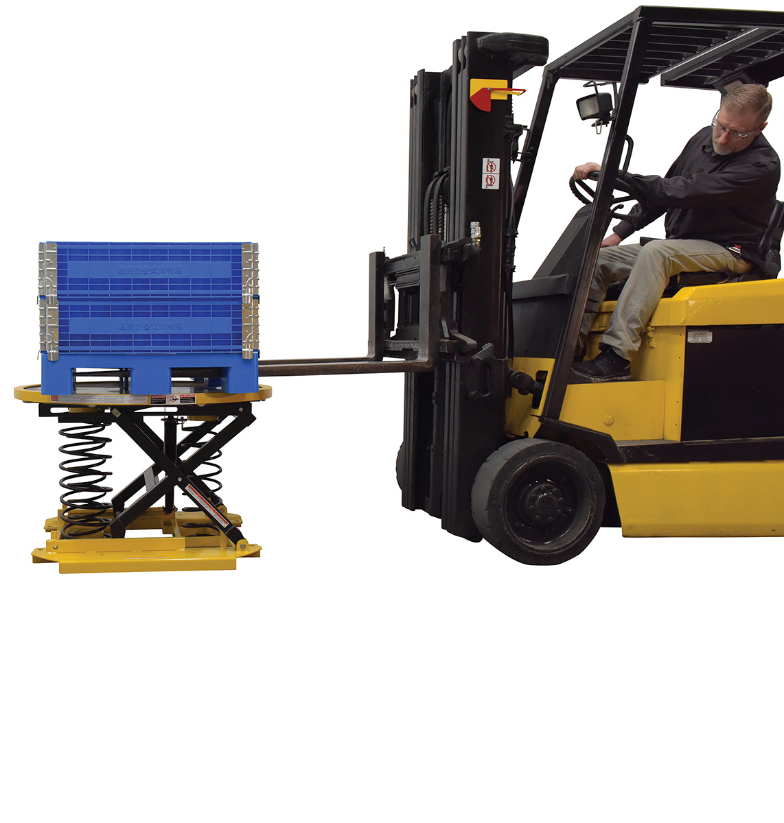 Steel Open Manual Carousel Top Spring Scissor Table 4,500 Lb. Capacity Black / YellowThe spring scissor table is ideal for distributing and shipping facilities. The unit allows the user to transfer products from work space to work space, while holding an ergonomically friendly position. The frame is designed of a steel construction, which allows for strength and durability. The scissor mechanism raises the unit to the desired height, while the internal spring provides support when unit is being loaded and unloaded. The round top manually rotated for improved packaging and handling capabilities.