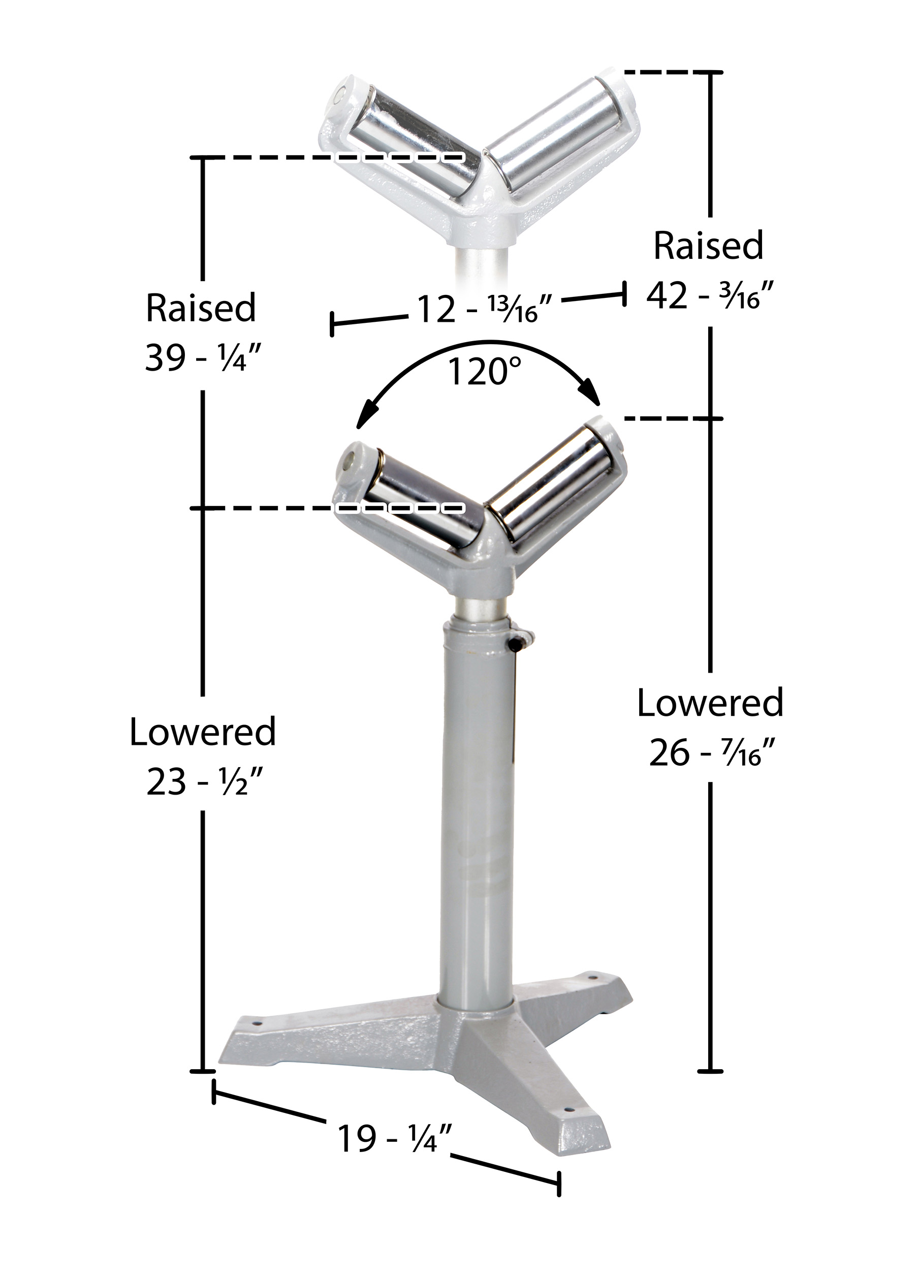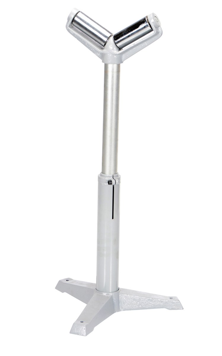 Steel Roller Stand 23-1/2 to 39-1/4 Raised Height 1,760 Lb. Capacity SilverThe deluxe roller stand is designed for use as an extra hand when working with long materials. Each stand includes chrome plated rollers and heavy-duty cast-steel base. This roller stand is a v-groove roller design. The height of each stand is adjusted with a friction lock screw or a gas charged cylinder. The unit is great for use in machine and wood shops.