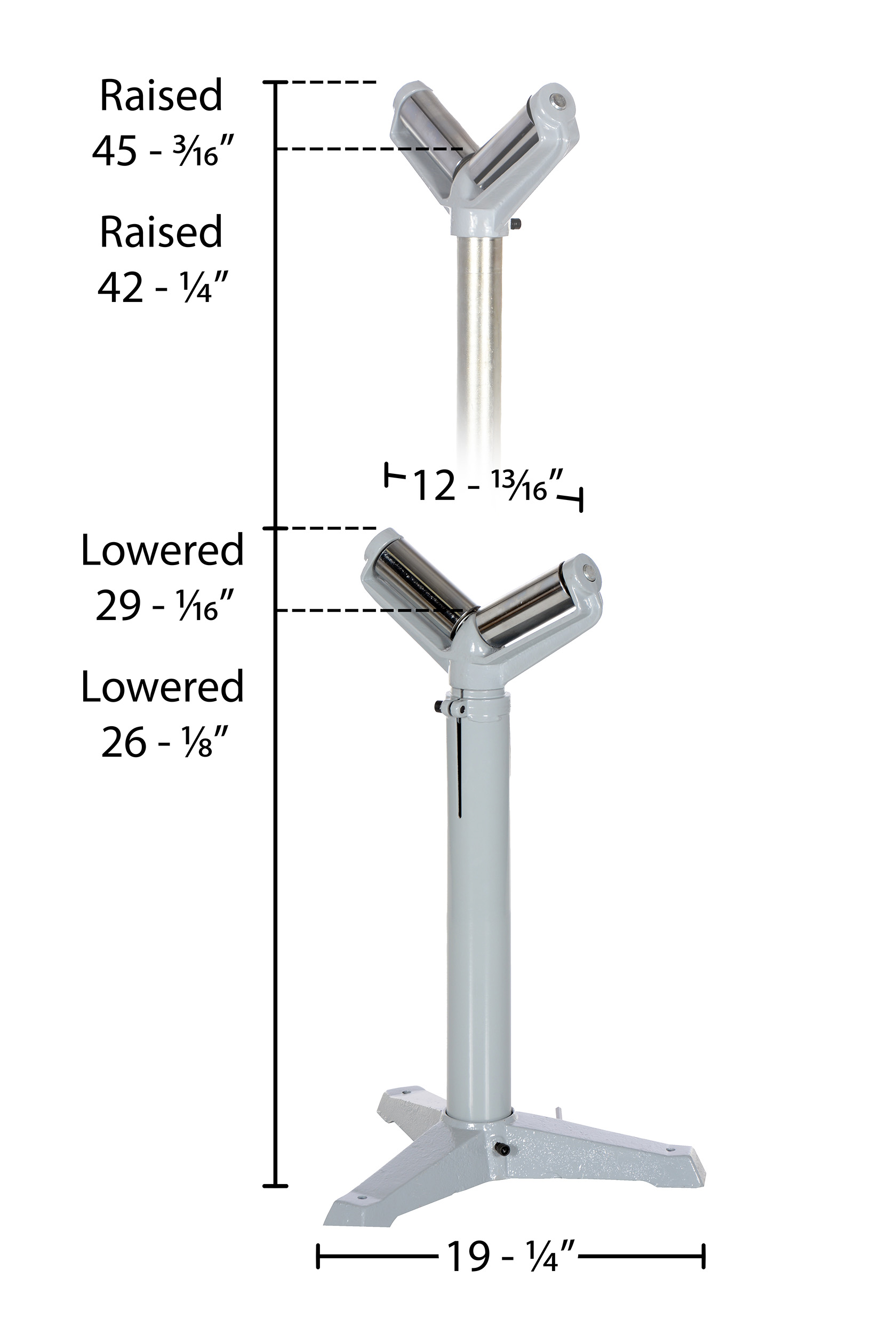 Steel Roller Stand Quantity 27 In. to 42 In. Raised Height 1,760 Lb. Capacity SilverThe deluxe roller stand is designed for use as an extra hand when working with long materials. Each stand includes chrome plated rollers and heavy-duty cast-steel base. This roller stand is a v-groove roller design. The height of each stand is adjusted with a friction lock screw or a gas charged cylinder. The unit is great for use in machine and wood shops.