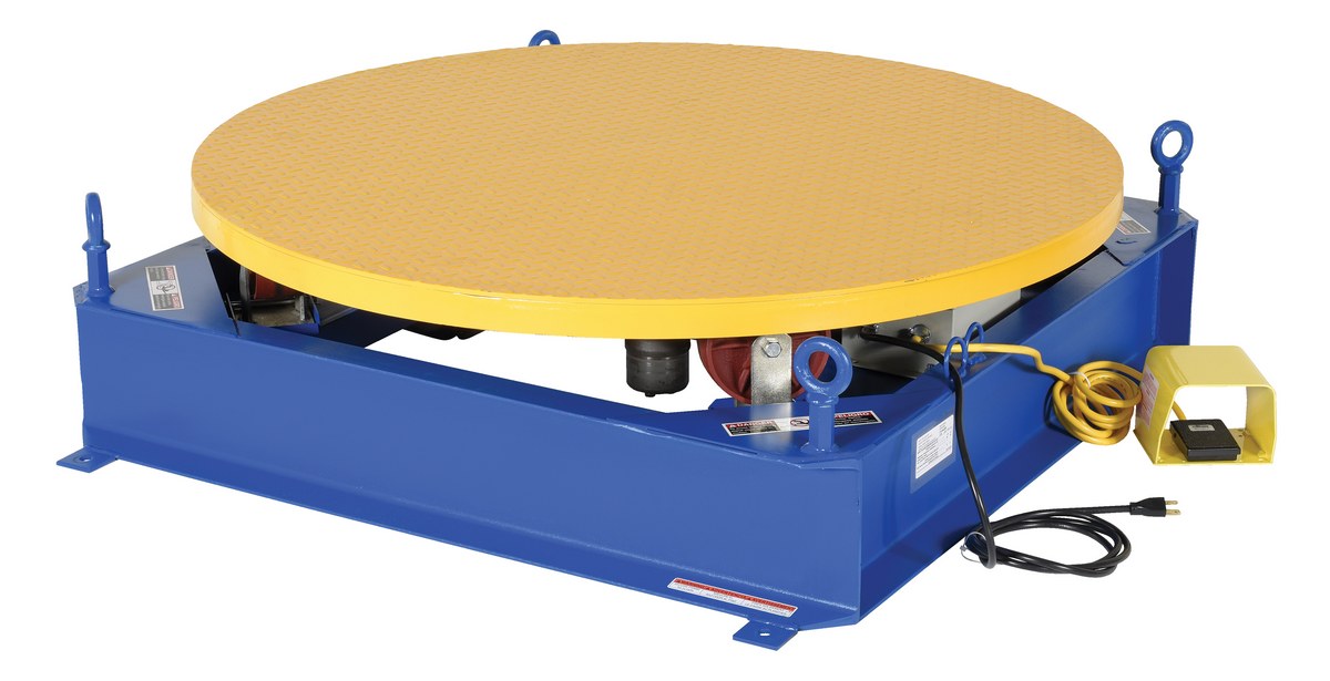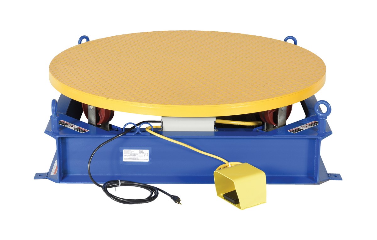 Steel Electric Hydraulic Stand Alone Powered Carousel 4,000 Lb. Capacity Blue / YellowThe stand alone powered carousel easily rotates pallets, skids, and other large objects with this rugged powered carousel. This carousel includes a round tread plate turntable that is supported with inverted casters for use as bearings. Also included; turntable, base, power unit, and fixed-speed control. Unit has a heavy-duty steel construction.