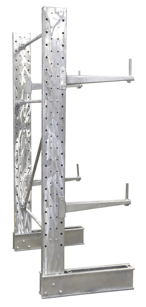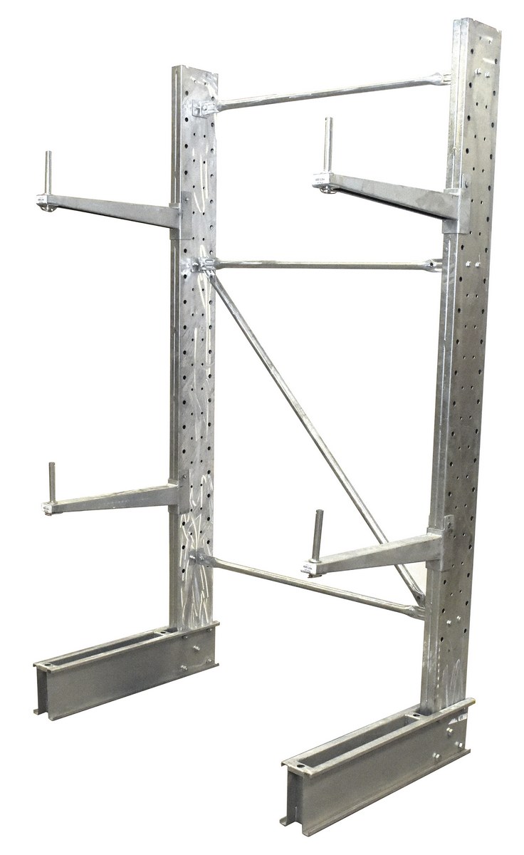 Galvanized Steel Standard Duty Cantilever Single Sided Upright 8 Ft x 30 In. To 36 In. Arm Gray SetA galvanized cantilever rack kit makes storing and picking large items as simple as can be. A strong steel construction with a galvanized finish makes an already durable product even more robust. The single sided unit can be maneuvered into certain boundaries and up against walls. The rack includes pre-drilled holes for mounting the uprights to the surface of the users choice. Capacity is calculated per level.