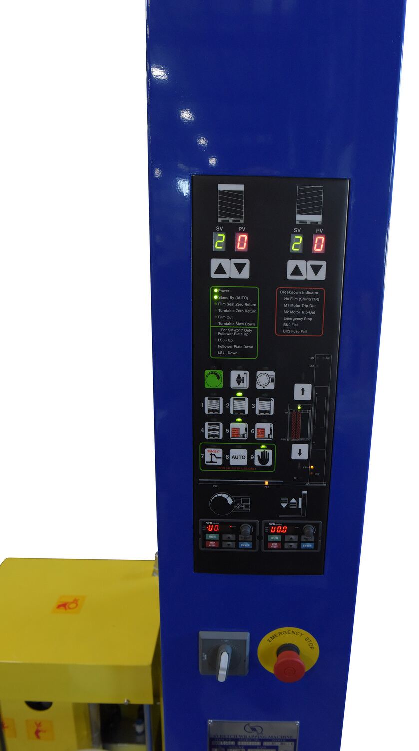 The Medium Duty high performance auto-wrap stretch wrap machine has a user friendly control center that provides workers with efficient control of the wrapping process. The state of the art digital control circuit allows the operator to set the number of pallet rotations and film wrapping patterns, with four (4) standard multifunction wrapping patterns. The operator simply ties off the film wrap on the carousel and presses the start button. When the unit has completed the wrapping process, the operator can simply cut film or use auto brake feature and remove the wrapped pallet. The powered carousel has variable speeds with a soft start and stop feature. Photocell sensors automatically adjust to different pallet heights.