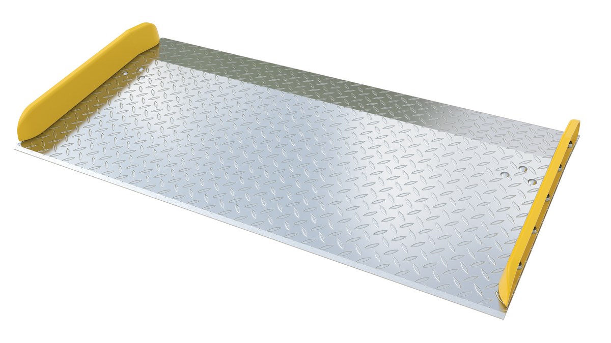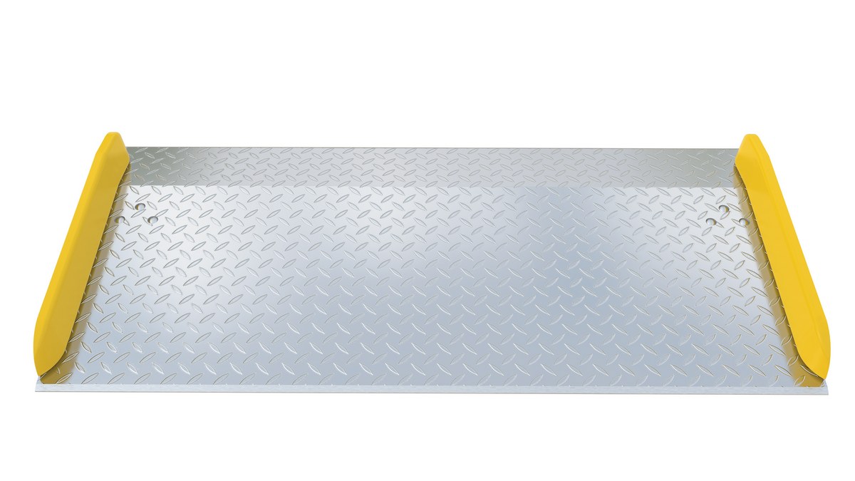 Aluminum Dock Board Steel Curb 72 In. x 36 In. 20,000 Lb. Capacity SilverThe Aluminum truck dock board with steel safety curbs is designed for portability and safety. The deck is made of tough high strength aluminum tread plate. The edges are beveled for smooth entry and exit. Safety curbs are coated yellow and are constructed of steel with cast tapered ends. Steel legs are bolted on for increased durability. Canted locking legs for easier truck portability. Manufactured in compliance with OSHA. The capacity is based upon the heaviest type of equipment used plus the maximum load carried times the single axle rating of total load. Dynamic loading, driver tendencies, speed and frequency of use must be considered. When using three-wheeled fork trucks order dock board with capacity at least four-times the lifting capacity of fork truck. The width of the dock board should be at least fifteen (15) inches wider than the load or equipment passing between the curbs. If the load does not pass between curbs, but is elevated above, add fifteen (15) inches to overall width of equipment.