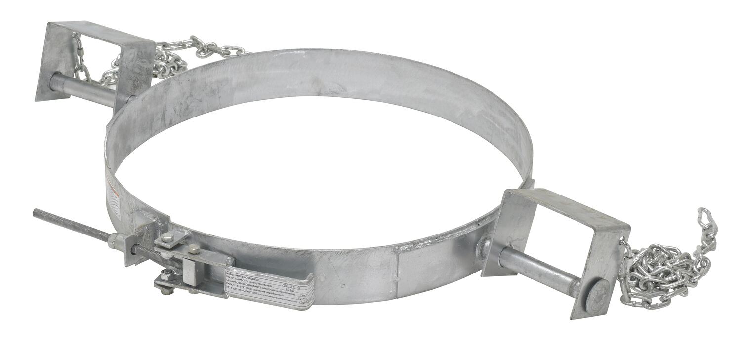 Carbon Galvanized Steel Tilting Drum Ring 55 Gallon Drum 1,200 Lb. Capacity GrayEasily transport steel drums with your fork truck and the tilting drum ring. Pivoting fork pockets allow you to manually rotate drum to dispense light materials. To use, slip the band over the belly of the steel drum and tighten the lock to secure the band around the belly of the drum. Welded steel construction.