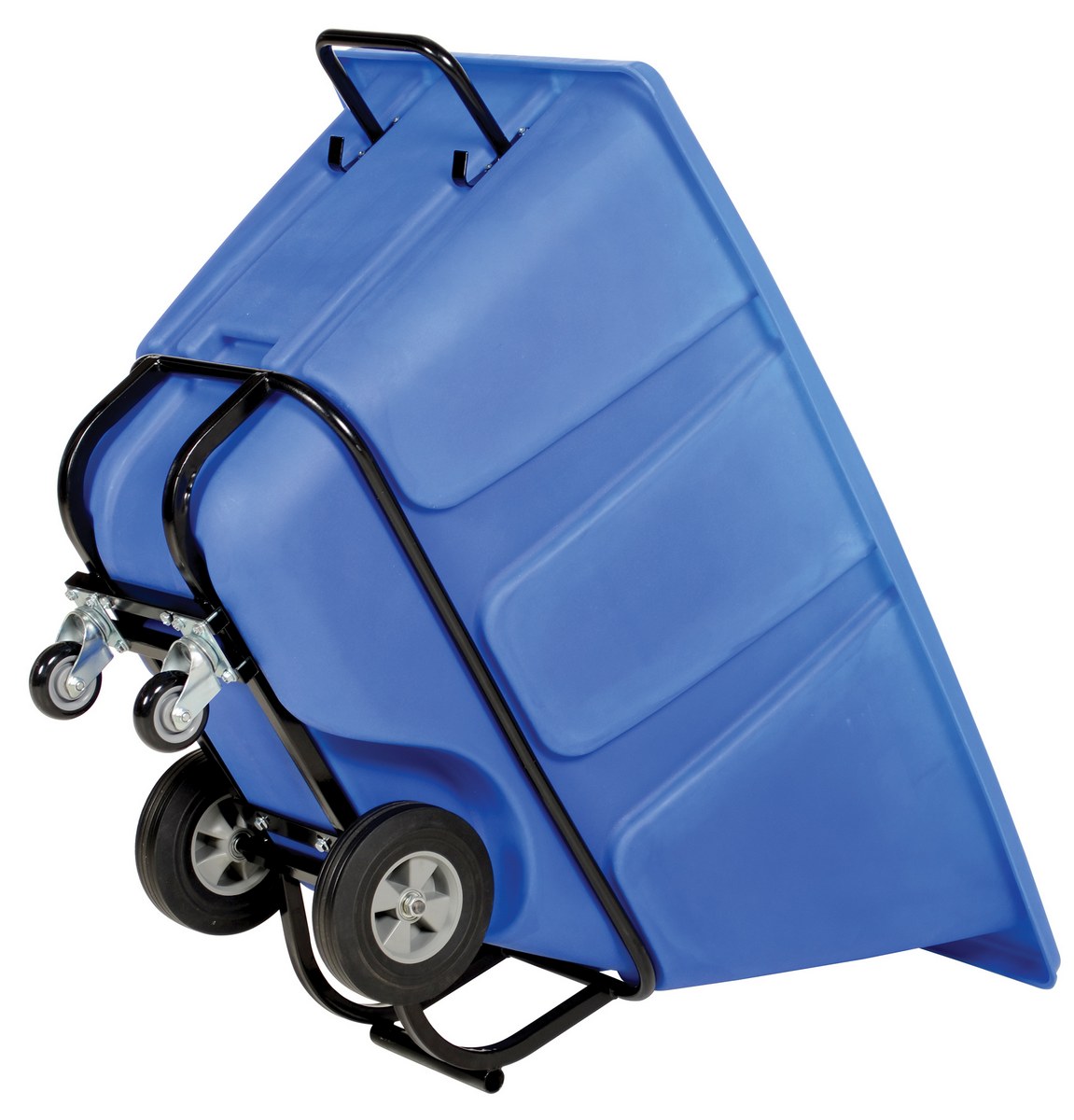 Durable plastic construction allows for collecting waste from multiple bins at a collective time. Great for warehouses, fairs, ball parks, schools, etc. Strong, one-piece molded polyethylene body with steel base tip support and a balanced design to allow for simple dumping by one person. Easily portable on 2 large rubber wheels and two swivel wheels. Not for use with fork trucks. Blue color design.