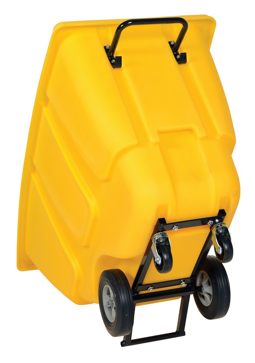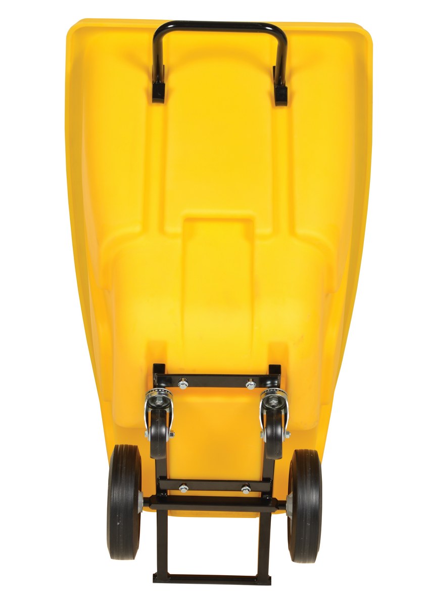 Durable plastic construction allows for collecting waste from multiple bins at a collective time. Great for warehouses, fairs, ball parks, schools, etc. Strong, one-piece molded polyethylene body with steel base tip support and a balanced design to allow for simple dumping by one person. Easily portable on 2 large rubber wheels and two swivel wheels. Not for use with fork trucks. Yellow color design.