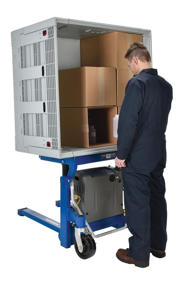 The tilt master lifts and positions filled tote boxes or baskets without the need of a fork truck or lift table using the newly designed heavy-duty tilt master. The tilter will function as transporters by moving completed products from work station to work station without waiting for a fork truck. The lift has a thin profile to allow the user to get as close to the load as possible, a standard floor lock and rolls easily on the phenolic steering wheels. It is designed to be used with open bottom pallets or skids. This unit is powered by an electric AC motor.