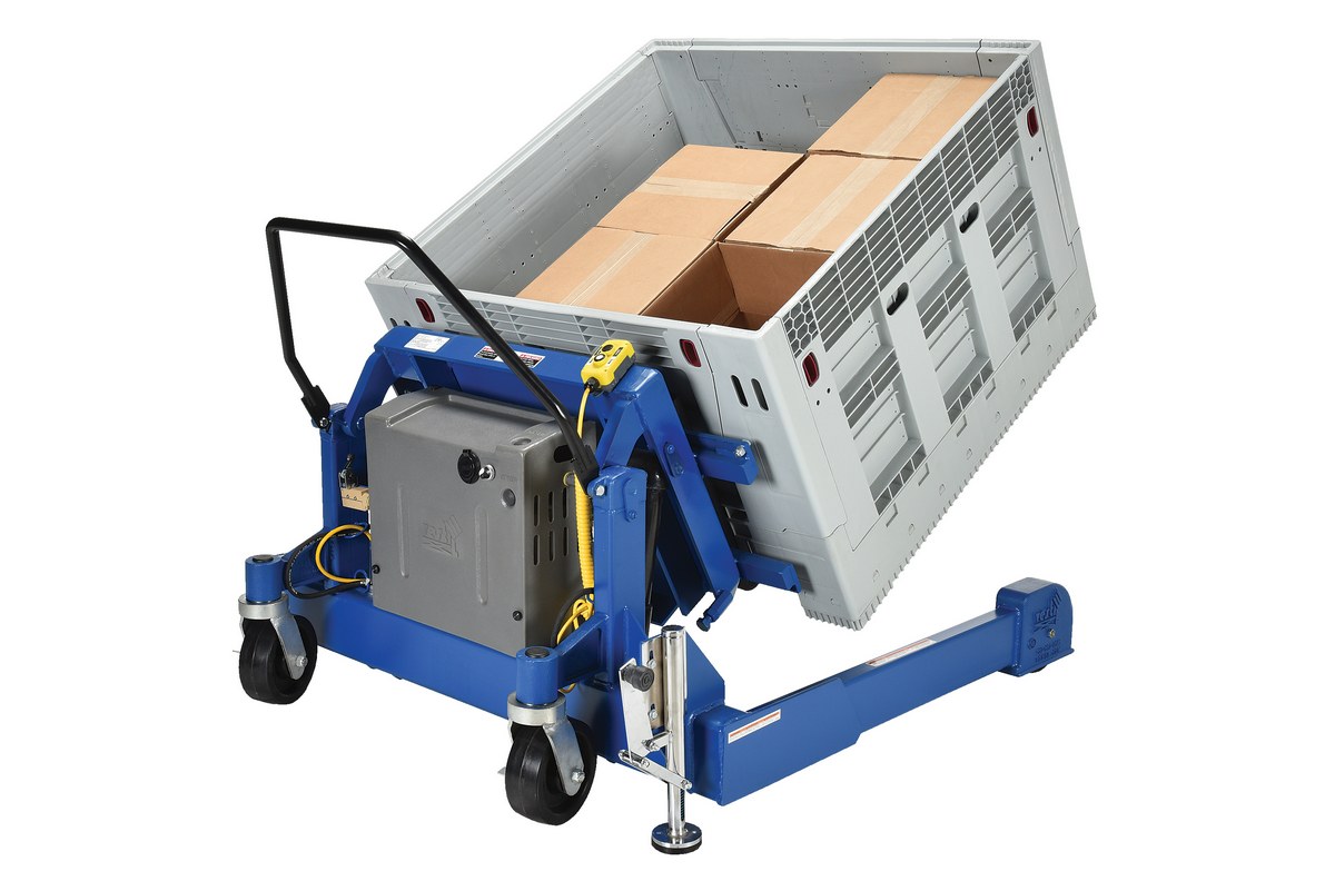 Steel Tilt Master Straddle AC Powered 2,000 Lb. Capacity BlueThe tilt master straddle lifts and positions filled tote boxes or baskets without the need of a fork truck or lift table using the newly designed heavy-duty tilt master. The tilter will function as transporters by moving completed products from work station to work station without waiting for a fork truck. This lift has a thin profile to allow the user to get as close to the load as possible. The unit has a standard floor lock and rolls easily on the phenolic steering wheels. Lift is designed to be used with virtually any kind of container or pallet and is powered by an AC electric motor that.