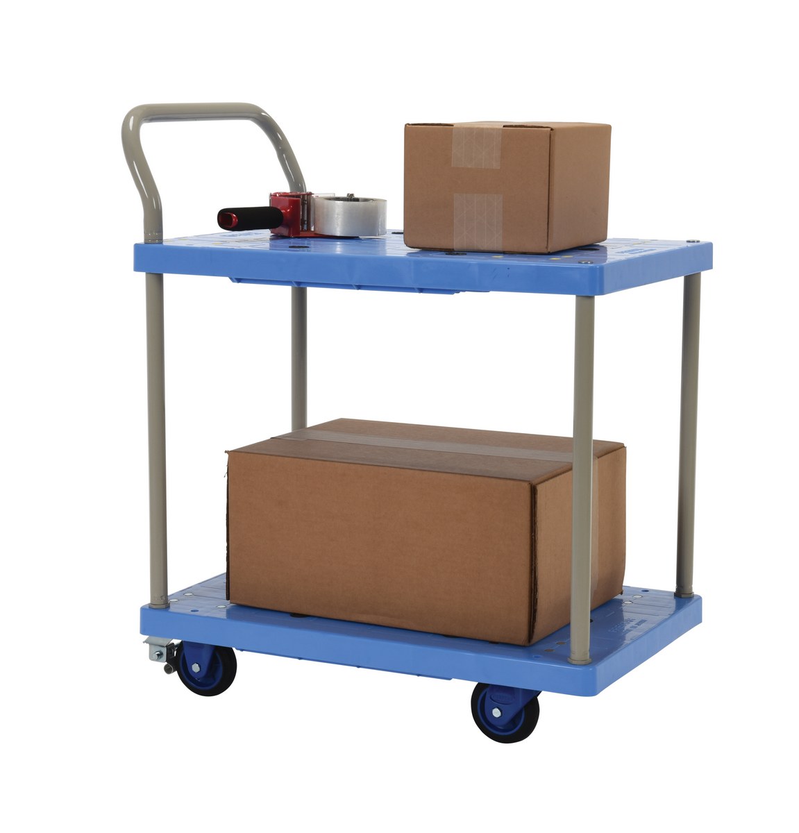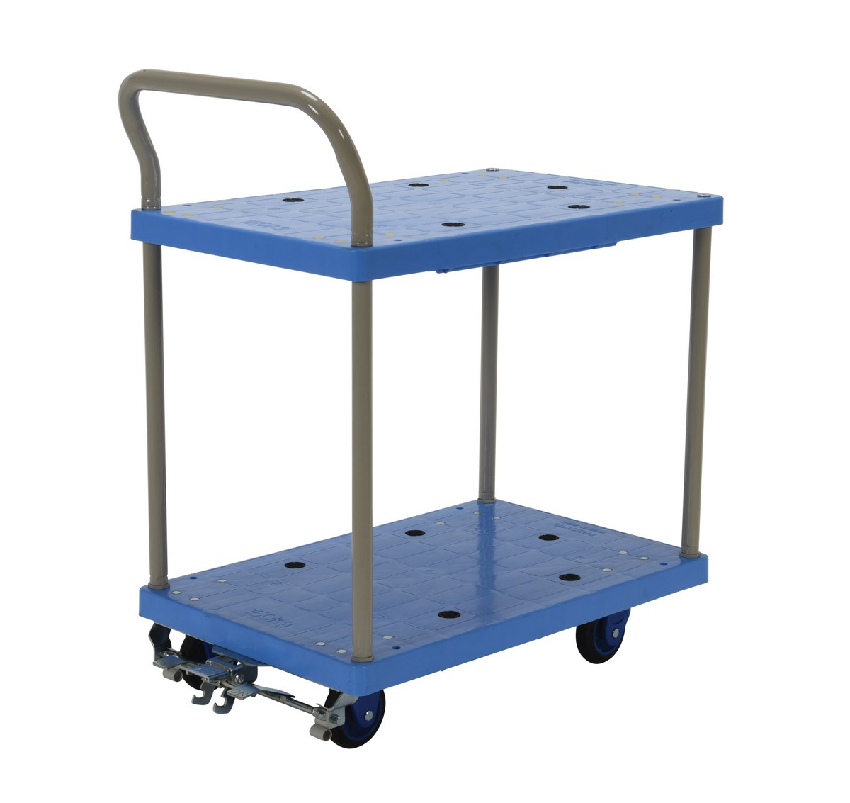 Plastic Truck Double Deck with Floor Brake 31-5/8 In. x 17-7/8 In. x 33-7/8 In. 330 Lb. Capacity BlueThe plastic platform cart is a great addition to the shipping and distributing facilities. The double deck plastic platform creates a durable, yet lightweight construction that can be transferred simply from workstation to workstation. The unit rolls on casters for smooth transference over a variety of terrains, while the brake keeps the unit steady when not in progress. The attached handle creates a more ergonomic posture of personnel during use.