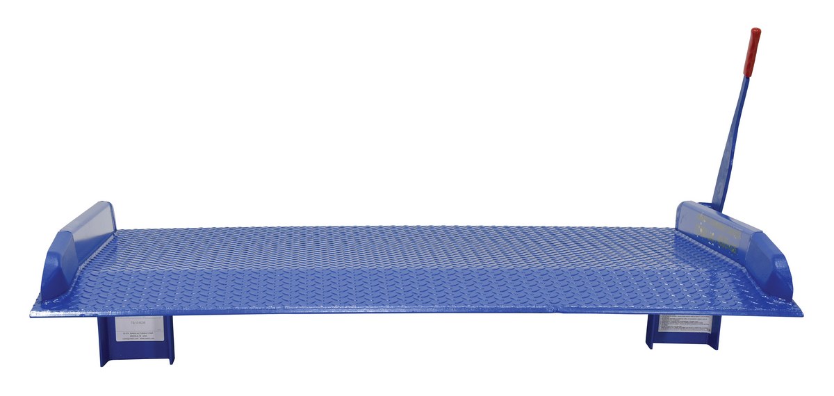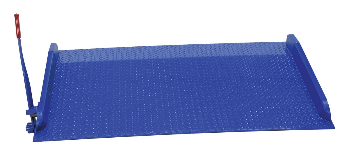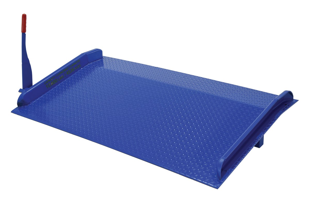 Steel Truck Dock Board 60 In. x 36 In. 10,000 Lb. Capacity BlueThe steel truck dock board is constructed of high strength (55,000 psi) steel for long life. Deck is diamond plated for safe, efficient use. Locking legs minimize ramp movement and are uneven to allow the dock board to sit canted for easier floor pickup by fork trucks when not in use. Standard with lever lift for quick portability with fork truck. Legs are located 12" from the edge of the dock board. Manufactured in compliance with OSHA. Optional accessories: lifting chains, span locks, span pins/holes and removable pickup loops.