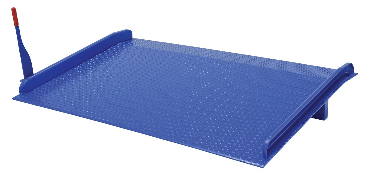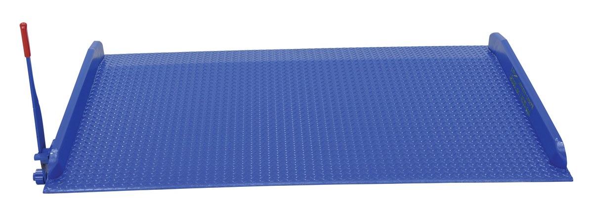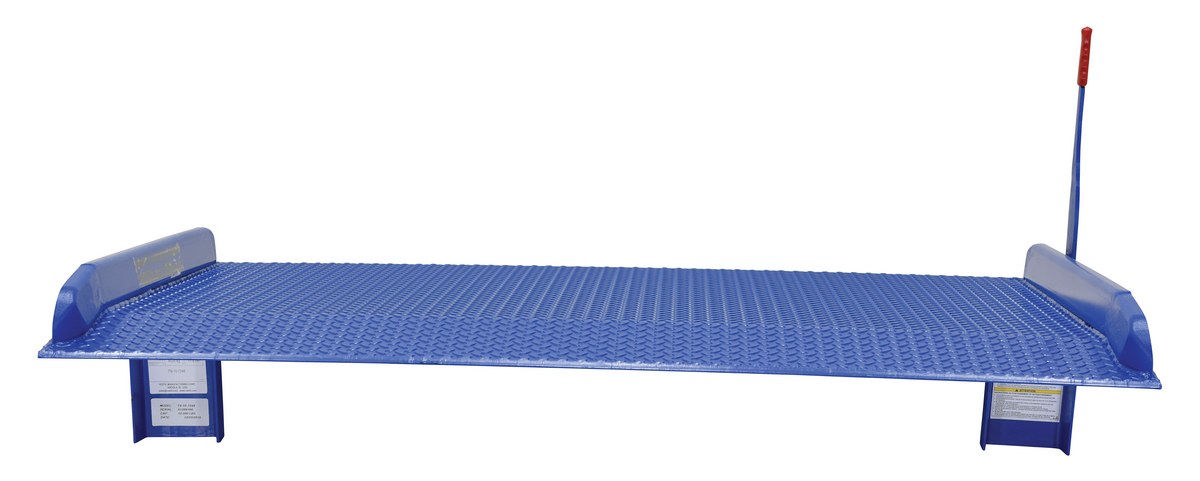 Steel Truck Dock Board 72 In. x 48 In. 10,000 Lb. Capacity BlueThe steel truck dock board is constructed of high strength (55,000 psi) steel for long life. Deck is diamond plated for safe, efficient use. Locking legs minimize ramp movement and are uneven to allow the dock board to sit canted for easier floor pickup by fork trucks when not in use. Standard with lever lift for quick portability with fork truck. Legs are located 12" from the edge of the dock board. Manufactured in compliance with OSHA. Optional accessories: lifting chains, span locks, span pins/holes and removable pickup loops.
