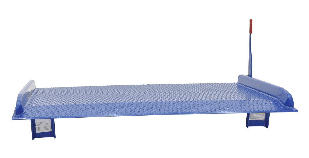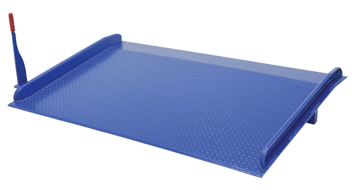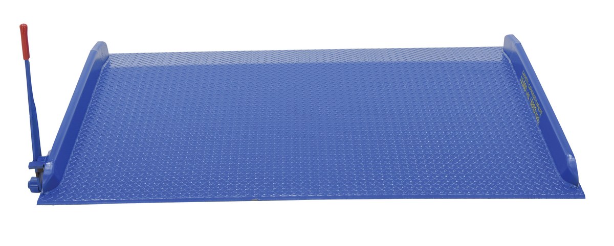 Steel Truck Dock Board 72 In. x 48 In. 15,000 Lb. Capacity BlueThe steel truck dock board is constructed of high strength (55,000 psi) steel for long life. Deck is diamond plated for safe, efficient use. Locking legs minimize ramp movement and are uneven to allow the dock board to sit canted for easier floor pickup by fork trucks when not in use. Standard with lever lift for quick portability with fork truck. Legs are located 12" from the edge of the dock board. Manufactured in compliance with OSHA. Optional accessories: lifting chains, span locks, span pins/holes and removable pickup loops.