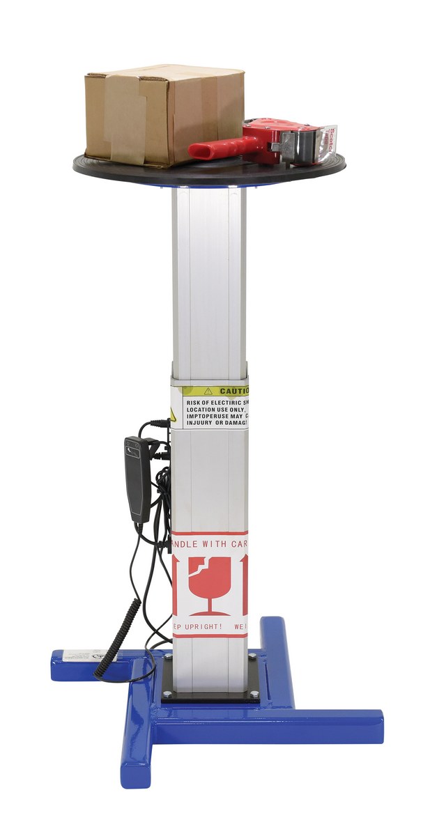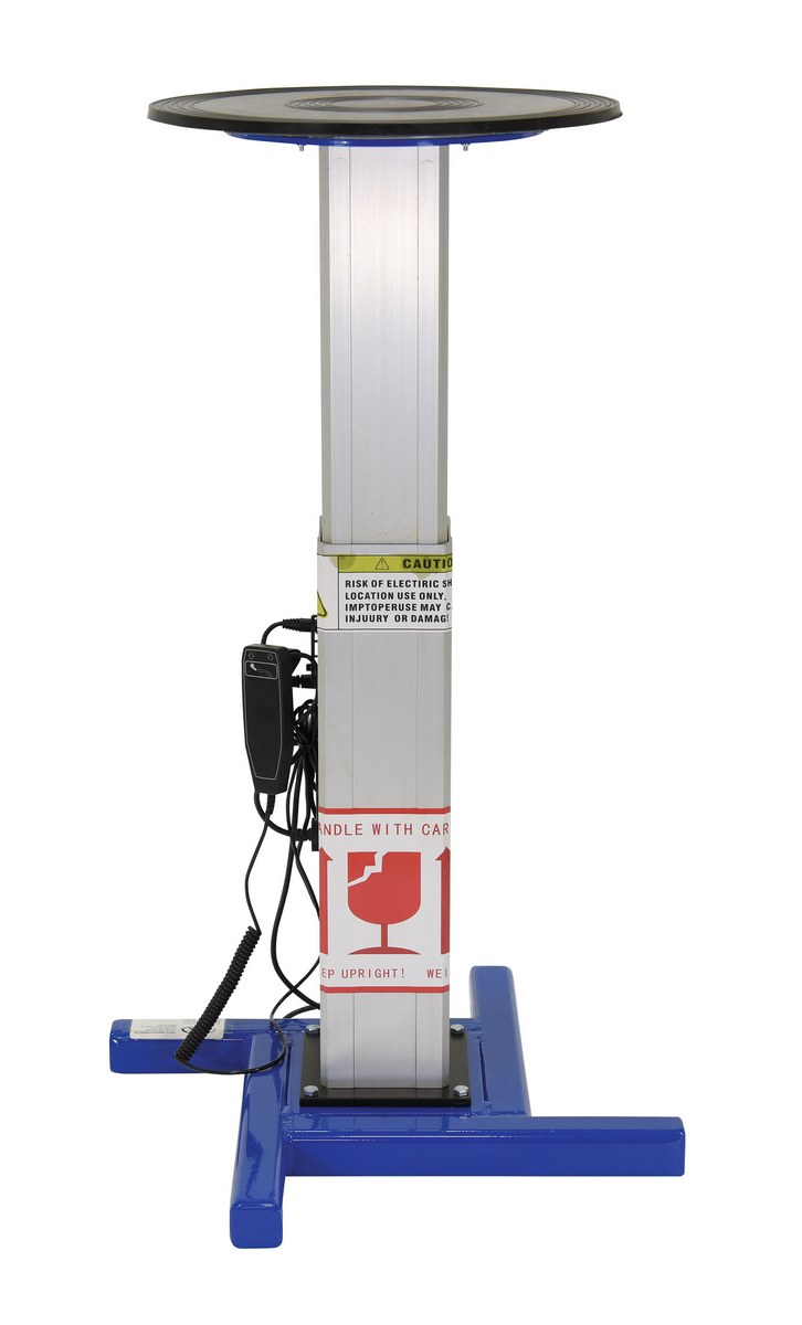 Steel Turntable 18 In. Diameter DC Powered 27-43 In. Height Adjustment 24V 750 Lb. Capacity BlueThe turntable with powered height adjustment allows the operator to raise or lower turntable to an ergonomic height. This unit has a manual turntable and is DC powered with hand control for height adjustment. Hand held pendant control connects to power unit with a coil cord. Height is adjusted with an electric linear-actuator.