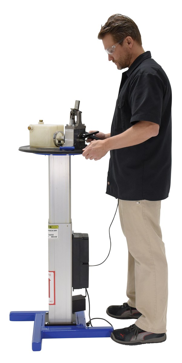 The turntable with powered height adjustment allows the operator to raise or lower turntable to an ergonomic height. This unit has a manual turntable and is DC powered with hand control for height adjustment. Hand held pendant control connects to power unit with a coil cord. Height is adjusted with an electric linear-actuator.