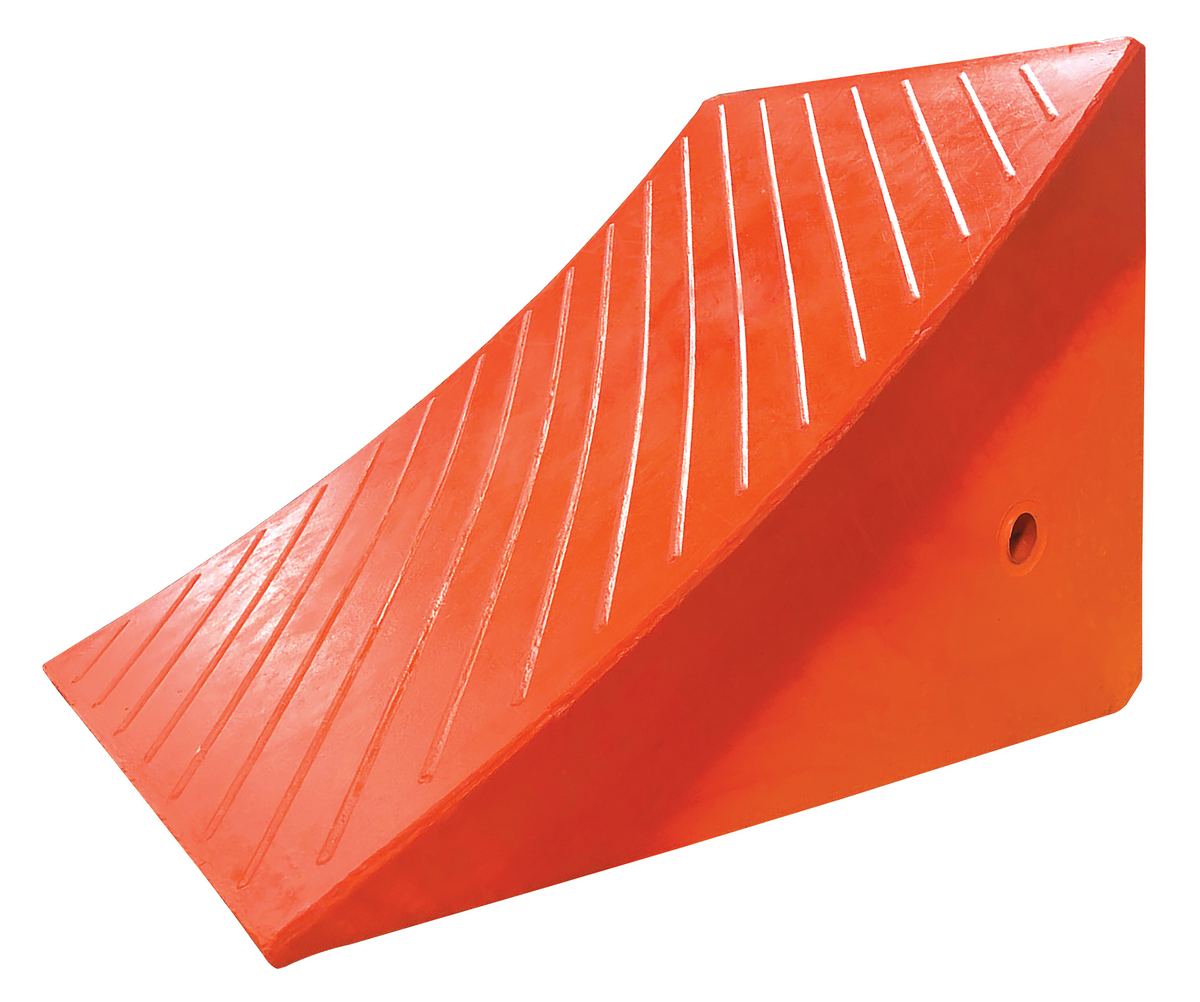 The mega urethane Wheel Chock is bright orange for greater visibility. Incoming and outgoing drivers can easily see for added safety. Safety tread on chock face provides better grip and reduces slippage. There is a mold-in hole through width of chock for attaching chain (chain not included).