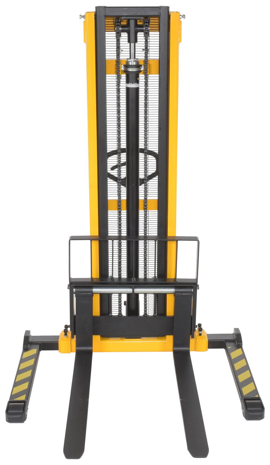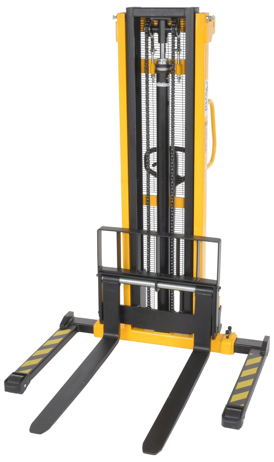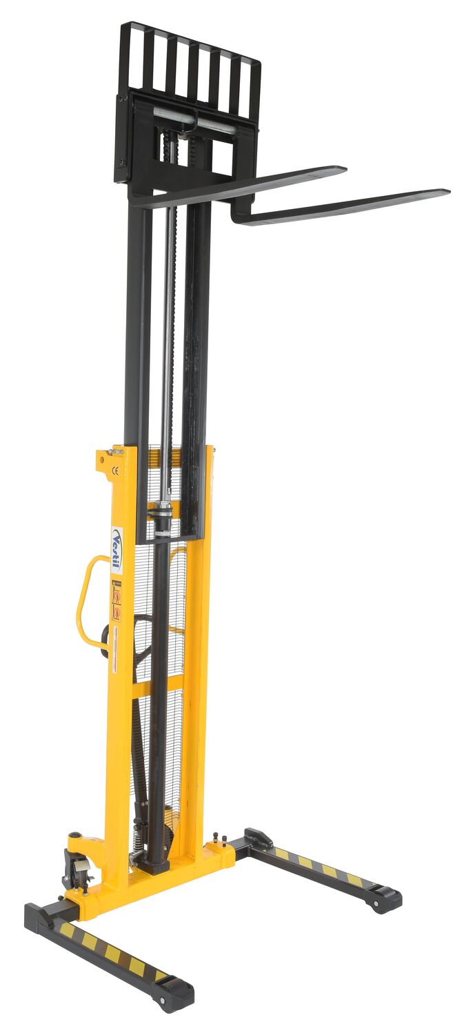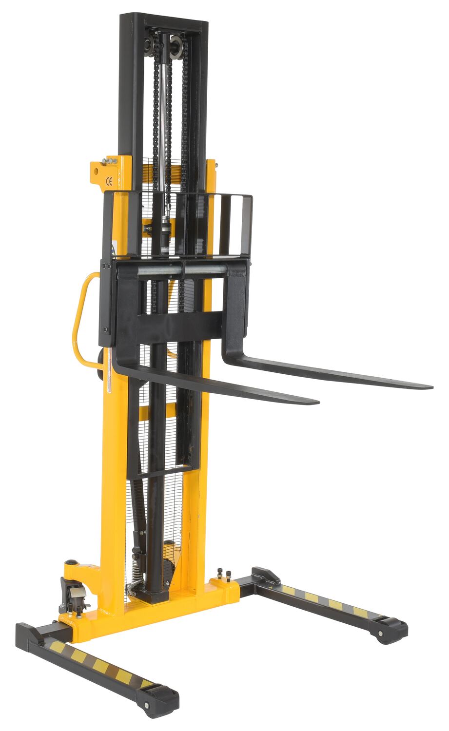 Steel Stacker Manual Pump 2 - 118 In. 1,500 - 2,000 Lb. Capacity Black / YellowManual Hydraulic hand pump stackers are sturdy and compact to fit through standard height doors. Forks are raised by manual hydraulic hand pump operation and released by a lever situated on the handle. 1" lift per handle pump. Two rigid and two swivel wheels standard.